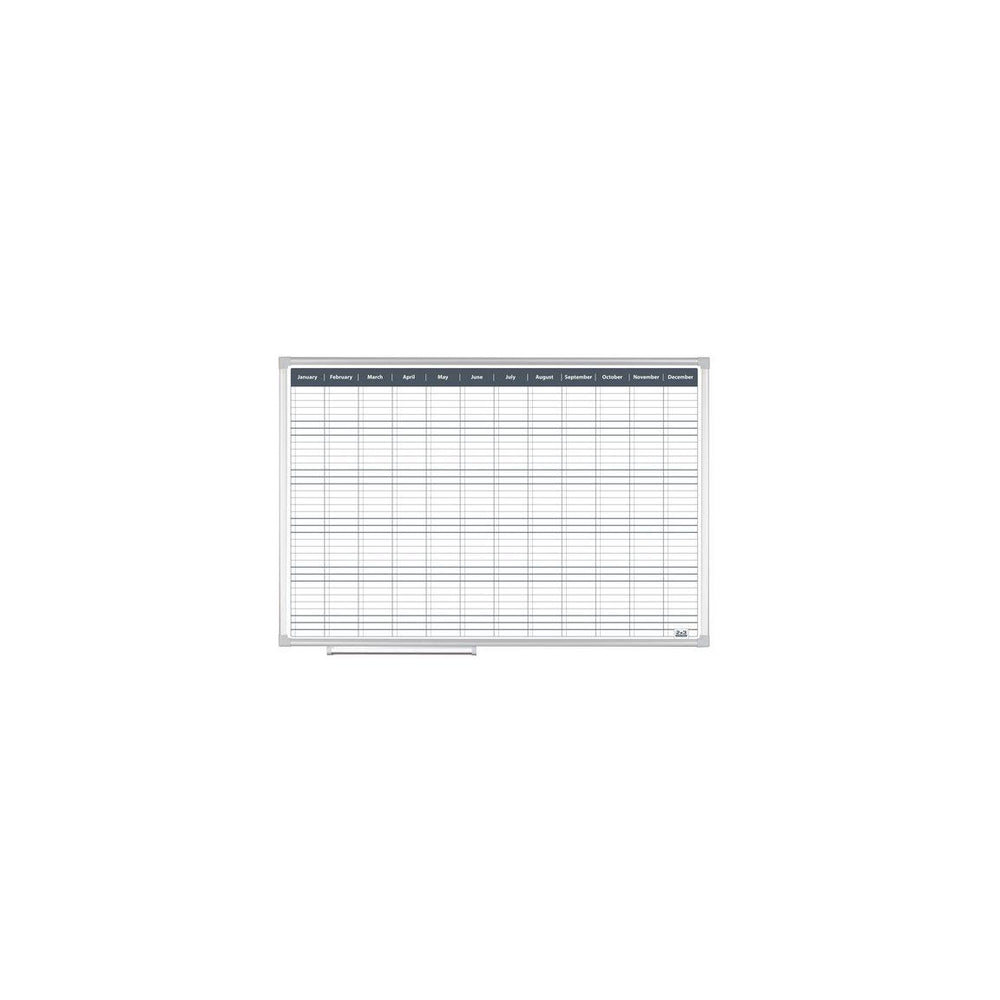 En magnetisk årsplan med aluminiumram och lackerad yta. Tavlan har en tryckt matris för årsplanering. Månaderna står vågrätt i den övre delen av tavlan. Texten är på engelska. Ingår monteringsset, 3 magneter, whiteboardpenna, pennhylla (30 cm). - Magnetisk - Storlek: 90x60 cm