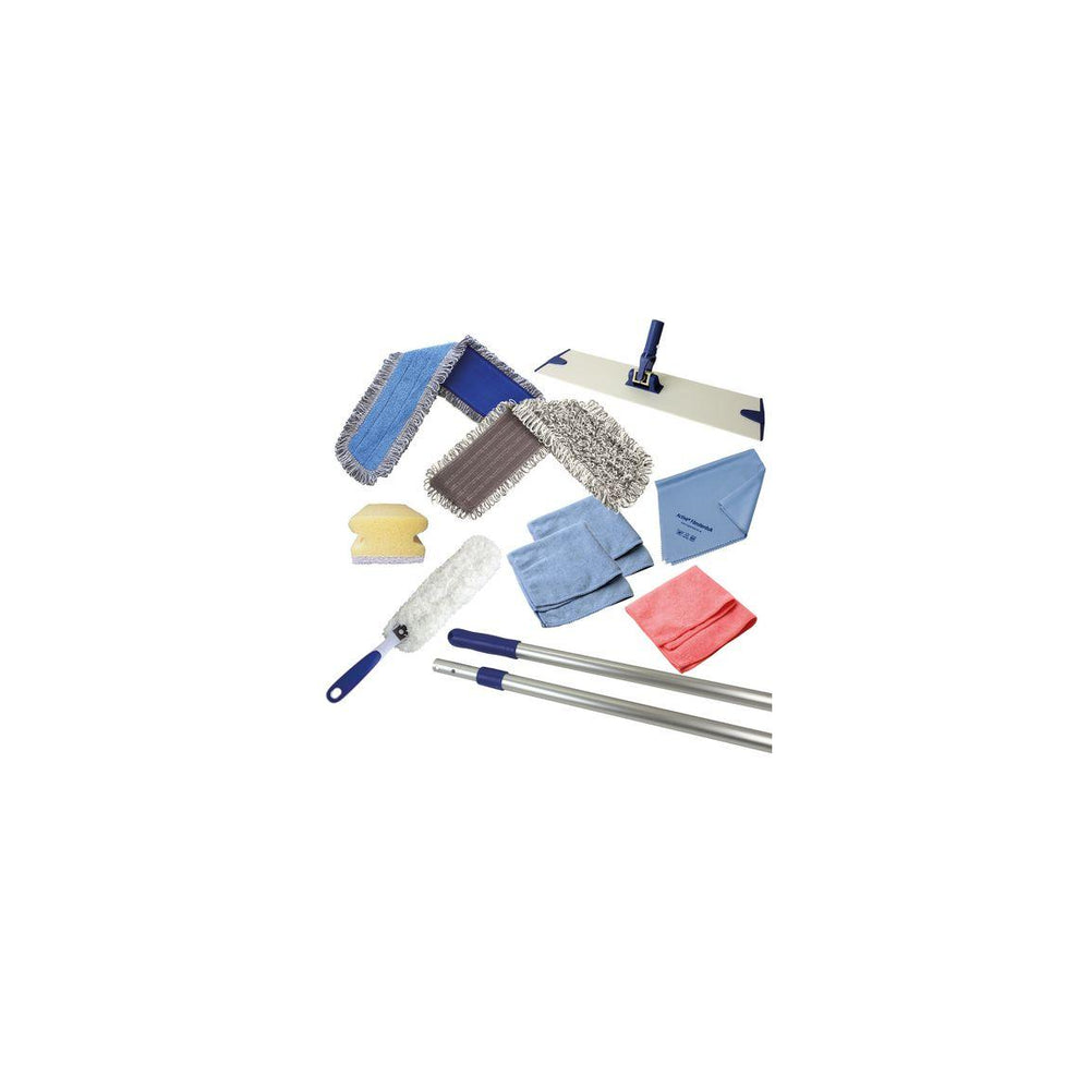 Ett mindre startkit för dig som behöver proffsigt städmaterial. Innehåller den viktigaste du behöver för en lyckad och ergonomisk städning. Ställbart redskapsskaft (1 st) Activa Damp mikrofibermopp 40 cm (1 st) Wetloop Pro mopp 40 cm (1 st) Moppstativ Lifetime 40 cm (1 st) MAX Microduk blå (2 st) MAX Microduk röd (1 st) Activa Fönsterduk (1 st) Activa Interiörmopp (1 st) Skursvamp med grepp (1 st)
