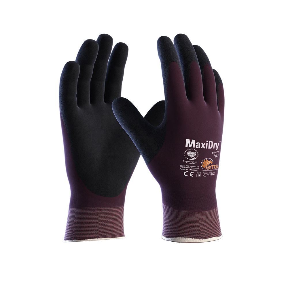 MaxiDry® FullTM 56-427 är delvis ventilerad och slitstark hudvänlig handske med perfekt passform, til lverkad i Spandex / Nylon / och doppad i Nitrilskum, för våta / oljiga miljöer. Handskarna levereras med en produktbeskrivande hängetikett.