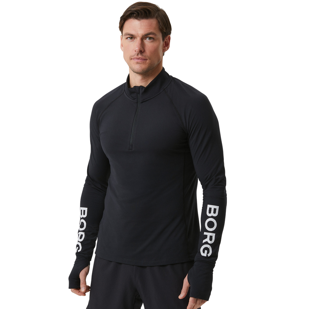 Björn Borg Borg Half Zip är en skön mellanlagertröja med hög krage och 1⁄2 blixtlås. Tillverkad i et t mjukt och följsamt material av återvunnen polyester och elastan. Passformen är lite längre i model len och med något längre ärmar med hål för tummarna. Bär den under en vindjacka för fler användnings områden.