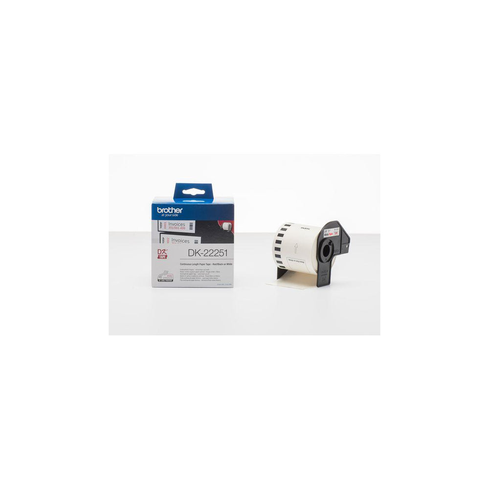 Etiketterna DK-22251 från Brother är perfekta för att löpande skapa etiketter som är skarpa och högkvalitativa. Den löpande utskriftsetikettrullen DK-22251 från Brother ger dig garanterat etiketter som är skarpa, tydliga och av god kvalitet. Etiketterna är utmärkta för märkning av filer, mappar och andra dokument på kontoret eller i hemmet. Med den här etikettrullen med svart och röd text på vit bakgrund som är enkel att installera kan du välja en egen etikettlängd för maximal flexibilitet. Tack vare avancerad teknik från Brother, samt svart text, kan den löpande etikettrullen DK-22251 även skriva ut i rött. Med DK-22251 sitter dina etiketter garanterat kvar och kan läsas under längre tid. - Märktejp - Kompatibla med: Endast QL-800-etikettskrivare - Form: Rektangulär - Färg: Svart/röd/vit - Längd per rulle: 15,24 m