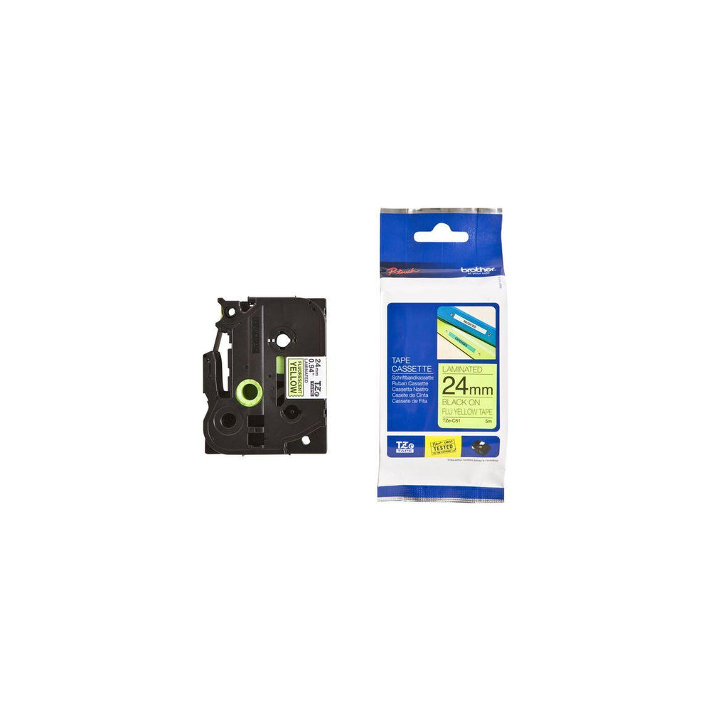 Brother TZeC51 etikettape, svart på fluorescerande gul, är perfekt för att framhäva viktig information, skriva ut varningsetiketter eller märka specialutrustning. Med TZeC51 säkerställer du att viktig utrustning hittas snabbt i en nödsituation. Kompatibelt med P-touch-märkmaskin som har TZ- eller TZe-logotypen på kassettkåpan. - Brother TZeC51 etikettape - Svart på fluorescerande gul - 24 mm