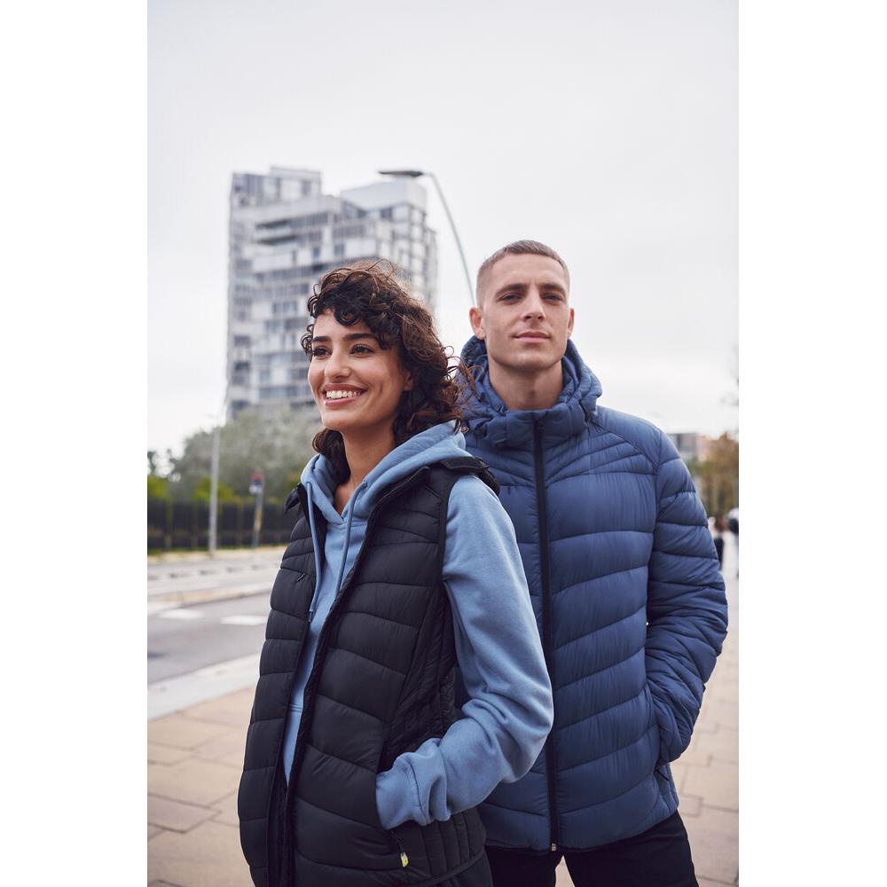 En varm och lätt väst med dunliknande vaddering. Tillverkad av 100% återvunnen polyamid. Tre ytterfickor med dragkedjor och två innerfickor. Elastisk kant nedtill och i ärmavslut. Dammodellen har avtagbar huva. Jackan är utrustad med färgade zippuller, hörlurslösning samt dragkedja.