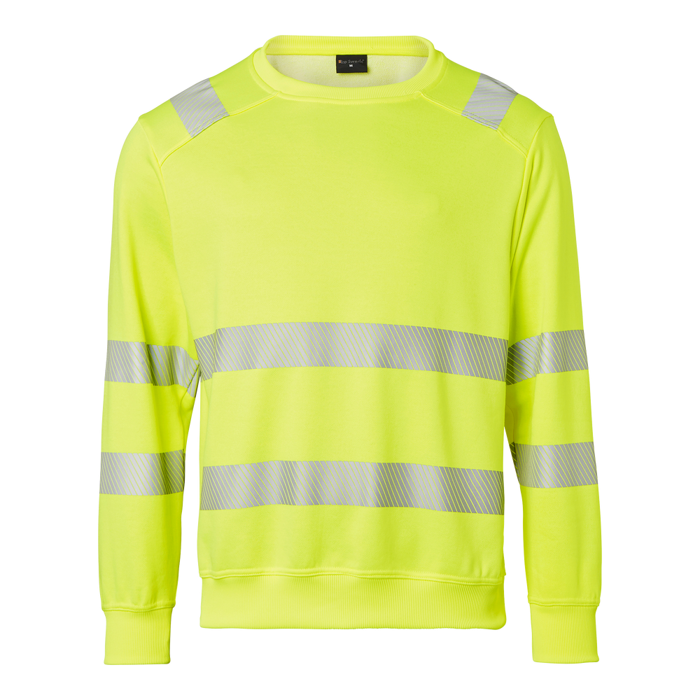 Sweatshirt med skuren reflex i stretch, rund hals, och mudd i nederkant och ärmslut. Perfekt för hög synlighet och komfort i arbetsmiljöer.