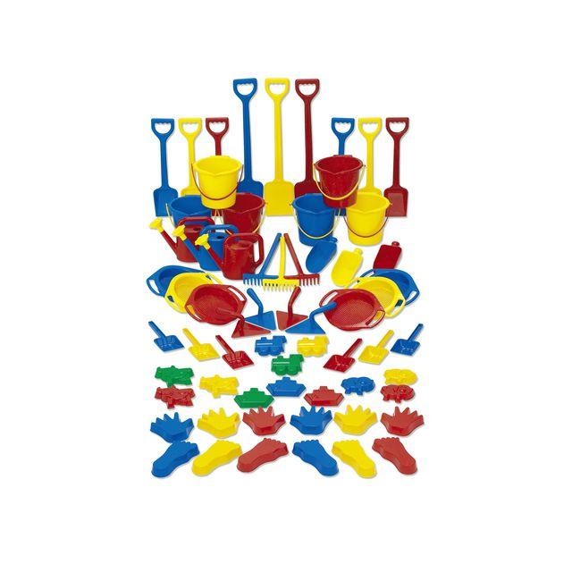 Detta kit innehåller hela 64 olika sandleksaker som dina barn kan bli kreativa med i sandlådan eller på stranden.