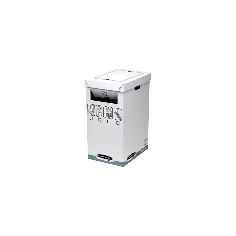 Återvinningskärl i FSC-certifierad kartong, Återvinningskärl som kan användas för top- eller frontöppning vilket gör att den enkelt kan anpassas för bruk under skrivbord eller som central återvinningsstation. Förtryckta kryssrutor gör det enkelt att identifiera innehåll. Avtagbart lock och bärhandtag underlättar användning och tömning. Rymmer upp till 90 liter, Fellowes säckar, art.nr 36054 passar. Tillverkad av FSC-certifierad kartong, 100% återvinningsbar - Yttermått: HxBxD 61x31,6x42,5cm