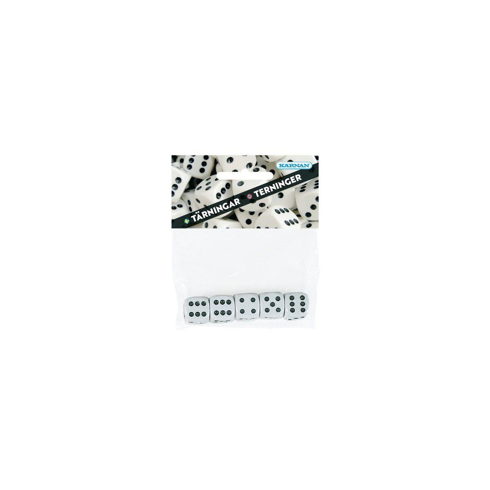 Karnan® erbjuder tärningar av professionell kvalitet så att du kan skapa dina egna brädspel eller ersätta borttappade tärningar från befintliga sällskapsspel. Den här tärningssatsen från Karnan® har fem tärningar som du kan använda för att skapa ditt egna brädspel för en rolig spelkväll med familjen. Den vita bakgrunden och kontrasterande svarta siffror får tärningskasten att sticka ut. Den här satsen med tärningar av professionell kvalitet låter dig spela alla dina favoritspel där man behöver en tärning. Varje tärning har mjukare hörn så att de rullar bättre. - Tärningar av professionell kvalitet - Mjuka hörn för att rulla bättre - Storlek: 16mm - Färg: svart och vit - FSC-märkt förpackningsmaterial - Varning. Lämpar sig inte för barn under 3 år
