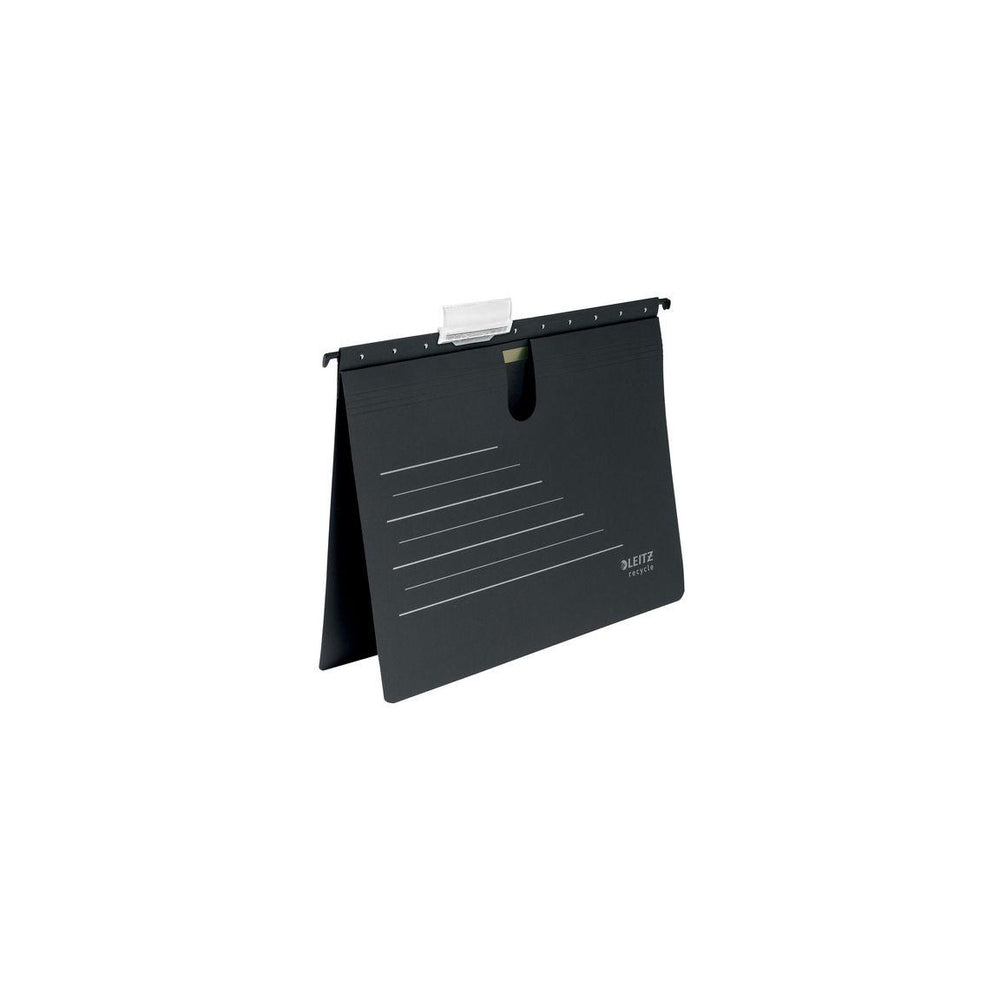 100% återvunnen kartong, 100% återvinningsbar. Blue Angel miljöcertifierad. Iögonfallande hängmapp av högsta kvalitet med V-botten som passar A4. Maximera lagringsutrymmet med vertikal arkivering för att hålla papper snyggt och tillgängligt. De starka hållbara skenorna tål tung användning och den medföljande etiketthållaren hjälper till att organisera och identifiera innehåll. Denna robusta hängmapp kompletterar perfekt andra produkter från Leitz Recycle-sortimentet och är gjord för att hålla. Med det nya återvinningsprogrammet från Leitz kan du både förbättra din kontorsmiljö - och miljön på vår planet. - Färg: Svart - Storlek: Storlek: A4 (31,5 x 24,1 cm) - Material: 100% återvunnen kartong - Botten: V-botten