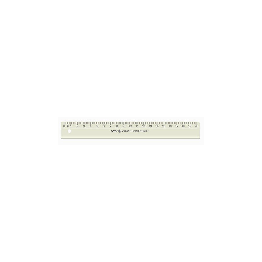 Linjal i naturmaterial 20 cm linjal. Tillverkad av 100% naturmaterial. Mätsidan har tuschkant som förhindrar att tusch flyter in under linjalen och smutsar ner papperet. Linjalen är tillverkad av genomskinlig majsstärkelse och har präglats biologiskt nedbrytbar färg. Emballaget är tillverkat av återvunnen papp som försetts med ett tryck av växtbaserad färg. Längd: 20cm Gradering: cm, mm