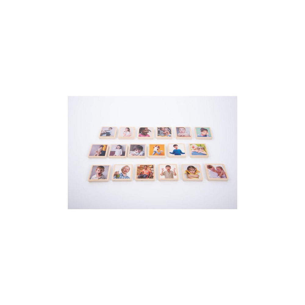 18 släta kvadratiska träplattor av björkplywood, tydligt färgtryckta på ena sidan med verkliga fotografiska bilder av barn som visar känslor. Perfekt för att prata med barn om hur de känner sig, lära dem att känna igen andras känslor och hjälpa dem att utveckla språket för att förklara sina känslor.