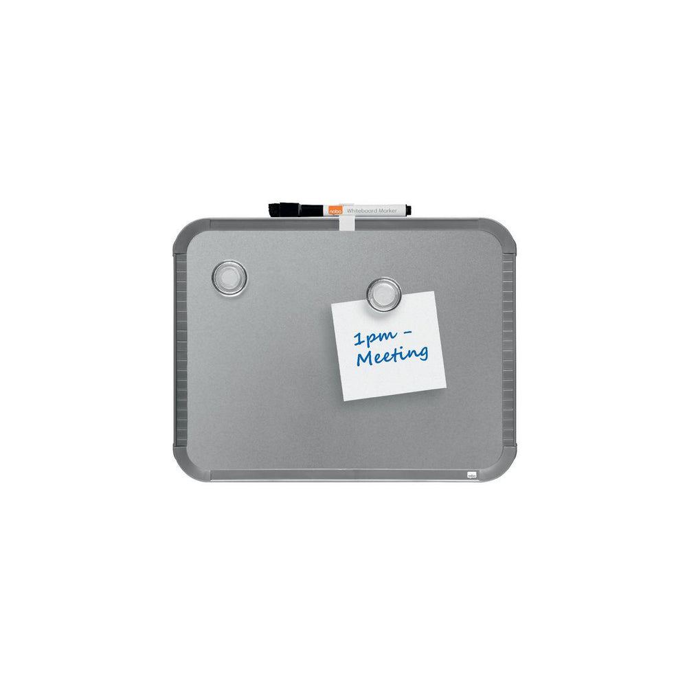 Magnetisk Nobo-whiteboardtavla att bära med sig eller sätta fast permanent Smart skrivtavla med magnetisk silveryta som passar både hemma och på kontoret. Kan monteras såväl liggande som stående. Det medföljer en avtorkningsbar penna, tavelsudd, fästkuddar för permanent fastsättning, magnettejp för montering på kylskåp och två magneter. Pennan kan även klämmas fast i listen på valfri sida. Rengör alltid tavlan med avsett rengöringsmedel för whiteboard. - Rengör alltid tavlan med avsett rengöringsmedel för whiteboard - Medföljer en avtorkningsbar penna, tavelsudd, fästkuddar för permanent fastsättning, magnettejp för montering på kylskåp och två magneter. - Kan monteras liggande eller stående - Silverfärgad ram i plast - Storlek: 28 x 22 cm