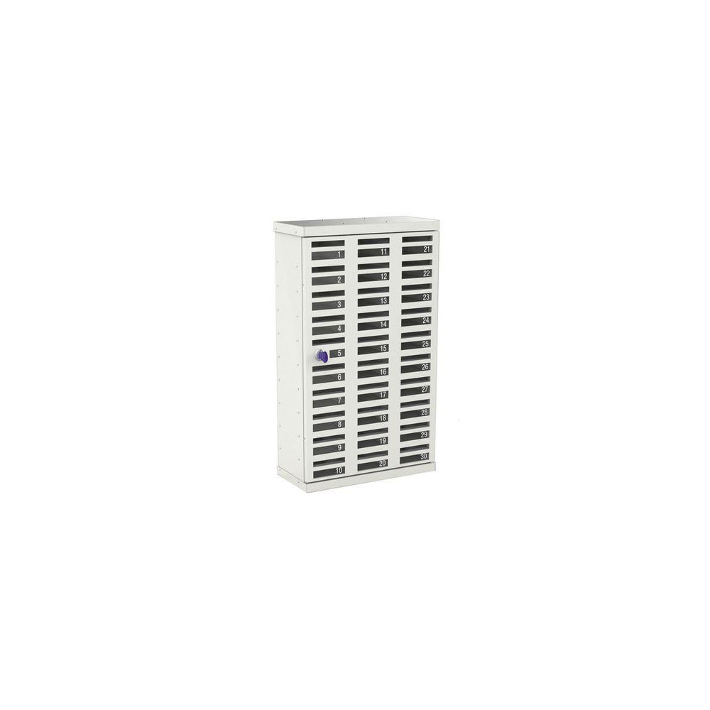Mobilförvaringsskåp för att skapa mobilfria zoner. Facken är genomskinliga för att kunna kontrollera att mobiler är inlämnade samt för att enkelt kunna lokalisera vart respektive mobil är förvarad. I varje fack finns även en matta för att minimera  skaderisken. Den låsbara med nyckellås till dörren ger tillgång till alla facken.  - Utvändiga mått: 700 x 400 x 180 mm  - Invändiga mått per fack: 62 x 109 x 155 mm  - Vikt: 7 kg