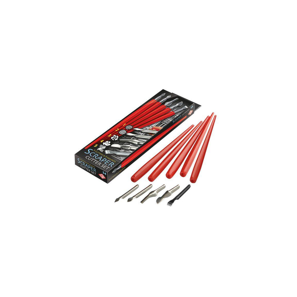 Set med 5 olika skrapknivar med skaft.