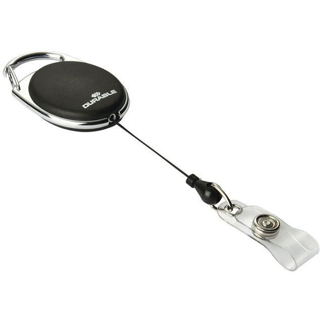 Sätt fast namnskyltar och ID-kort i jojon DURABLE för att hålla dem på plats. Denna jojo i oval form är ett snyggt och praktiskt kontorstillbehör, eftersom den håller ID-kort som namnskyltar och passerkort på plats. Dess 80 cm jojo ger snabb och enkel åtkomst till kort eller korthållare. Dessutom har den en metallklämma som kan fästas i ett hål som stansats på kortet. Tillverkad av PVC.