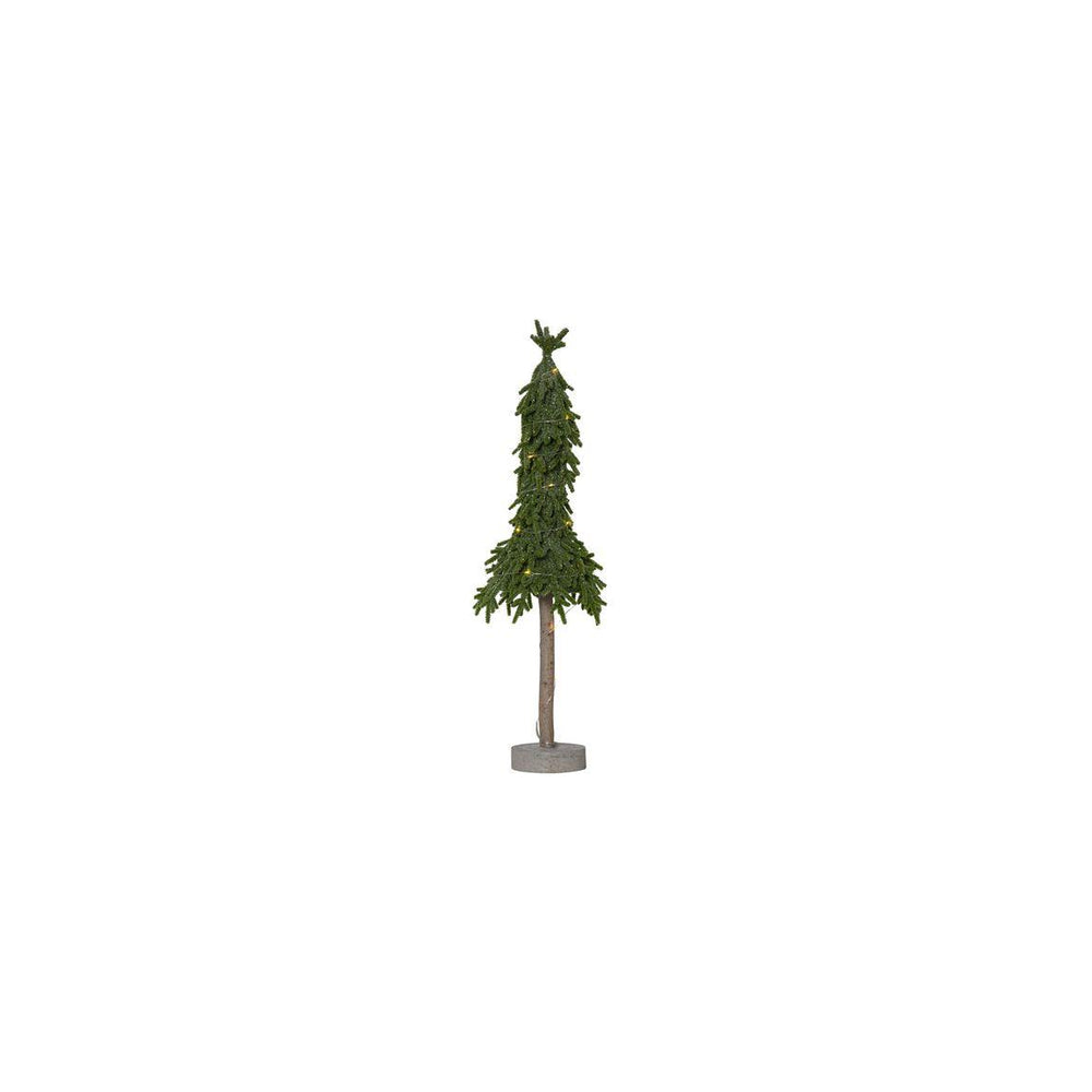 Bordsgran i PE material med lite glitter och fot av cement. Lyser upp med 20 små varmvita dewdrops.