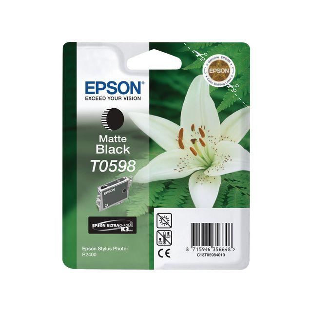 Epson T0598 matt svart bläckpatron ger högkvalitativa, glättade utskrifter på fotopapper. Epson T0598 matt svart Ultra Chrome K3 bläckpatronen är idealisk för tillförlitliga utskrifter och säkerställer högkvalitativa utskrifter av dokument och foton på alla medier. Den här Epson-kassetten ger levande, tydliga och skarpa utskrifter. Den användarvänliga patronen är kompatibel med olika Epson-skrivare och är dessutom enkel att installera. Den kan ge upp till 450 sidor med 5 % täckning.
