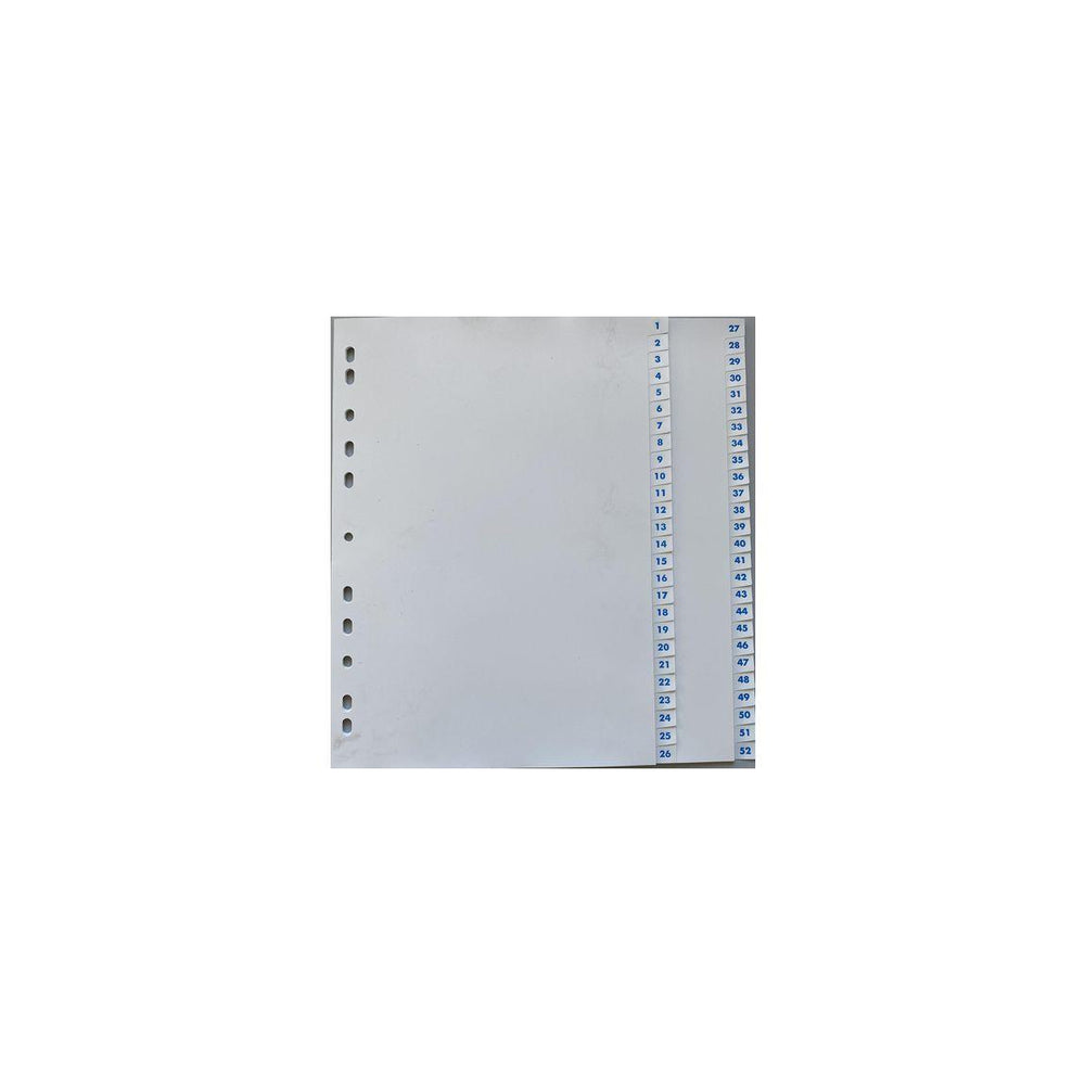 Numeriskt register i A4-format med vita registerblad av PP-plast med blå siffror. Med internationell hålning – 11 hål som passar de flesta vanliga gaffel- och ringpärmar. Smutsavvisande – perfekt för vardagsbruk och går bra att torka av. Tillverkat av återvunna material. - Register 1-52 - Format: A4 - Färg: Vit - Text: Blå - Material: Polypropylen (PP-plast) - Standard EU-hålning