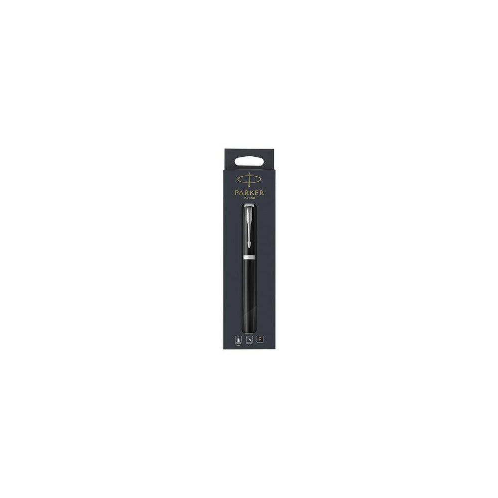 Rollerballpennan Parker IM har en modern fasad form för smidig och bekväm skrift. Den moderna designen hos den här rollerballpennan gör den till ett elegant tillskott på alla skrivbord. Den här pennans FreeInkflow®-teknik ger konsekventa linjer för prydlig skrift och är idealisk för användning i skolan eller hemma. Den kan användas med Parker rollerballpatroner och har en huv med clip. Den fasade formen, svartlackerade mässingen med kromdetaljer gör den här Parker-pennan till en imponerande och elegant present för studenter eller kontorspersonal. - Med huv - Spetsbredd: Medium - Kan fyllas på med Parker rollerballpatroner - Textfärg: Svart - Färg pennkropp: Svart