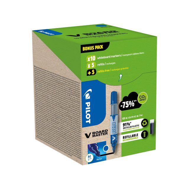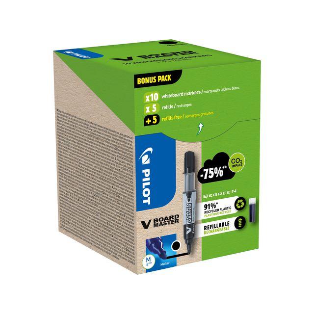PILOTs Greenpack erbjuder högkvalitativa pennor och tillhörande refills, i samma förpackning. Detta Greenpack innehåller våra V-board Master Whiteboardpennor i medium, rund spets och tillhörande patron. Med det konstanta bläckflödet till spetsen förblir din text skarp och läsbar, även på långt håll.