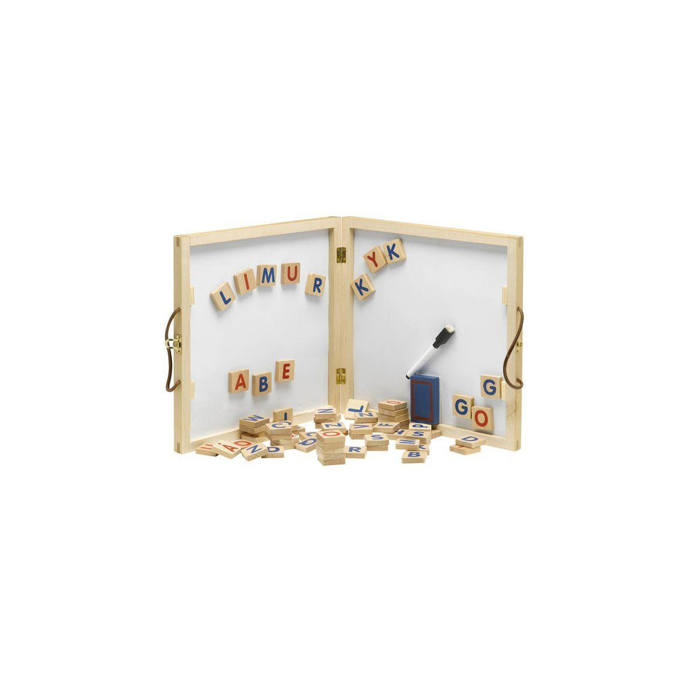 Ett bra sätt att lära sig alfabetet och att skriva. Innehåller tavla, whiteboard, torktrasa och 67 stycken bokstäver (versaler) med magneter. Innehåller 2 av varje bokstav undantaget A, E, I, O och U, där det är 3 stycken. - Mått: 30,5x30,5x4 cm - Rekommenderad ålder: 3+ - Material: Trä Varning. Lämpar sig inte för barn under 3 år