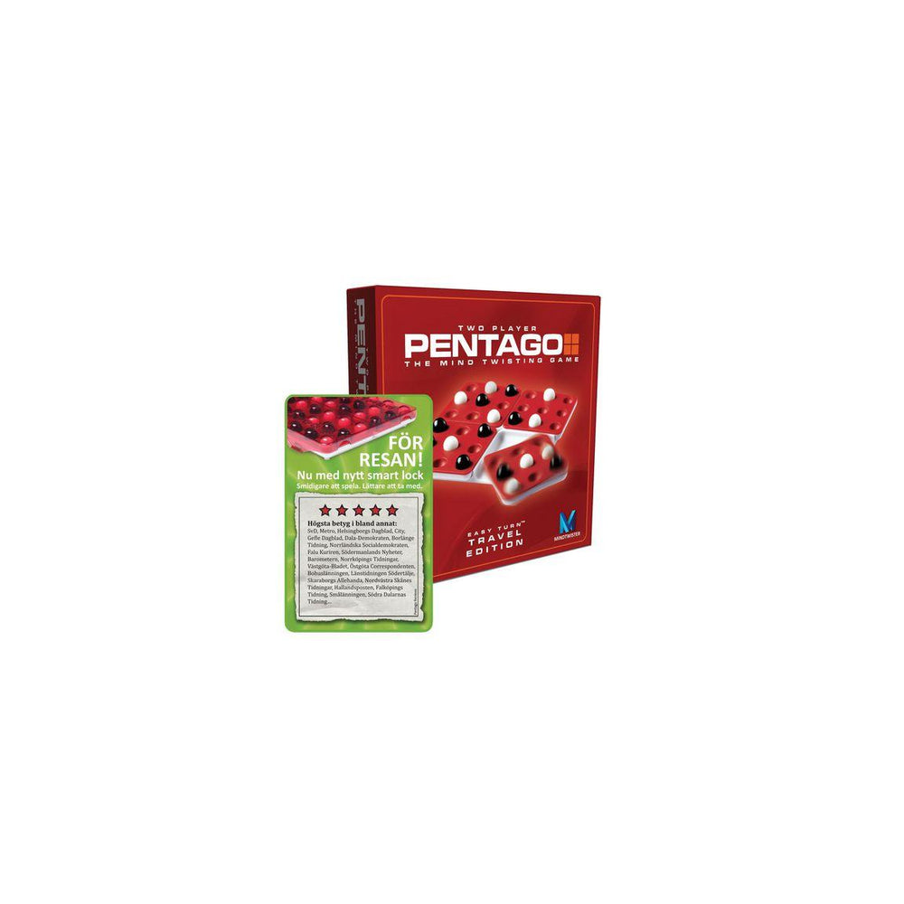 Sveriges mest prisbelönta spel genom tiderna. PENTAGO, är ett snabbt och roligt strategispel, lika enkelt som raffinerande. Den som först får fem i rad vinner. Men det finns en twist, efter varje lagd kula ska man även vrida en av spelet fyra brickor. När spelplanen ständigt förändras är det en större utmaning att få fem i rad än man först kunde tro... För demo och regler se http://www.m-demo.com/ OBS! Utseendet kan variera pga jubileumsgåva. - Antal spelar: 2 stycken - Speltid: ca 5-15 min - Rekommenderad ålder: 8+
