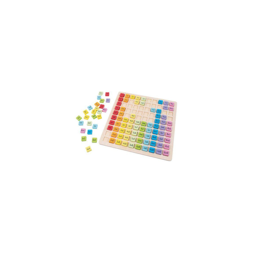 Bordet innehåller multiplikationstabellen från 1x1 till 10x10 och erbjuder ett roligt pedagogiskt sätt att lära ut och lära sig multiplikation.