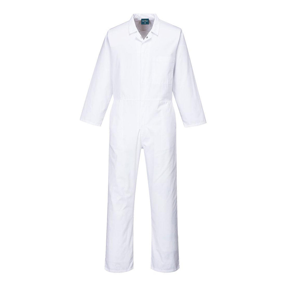 Livsmedelssäker overall utan fickor som kan samla smuts och bakterier.