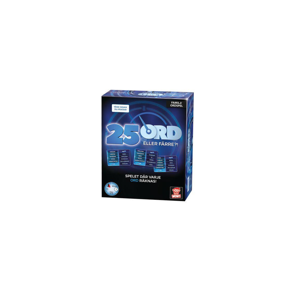 25 Ord eller färre - Få ditt lag att gissa de 5 orden på kortet genom att använda så få ord (ledtrådar) som möjligt. Först budar lagen på hur många ord (ledtrådar, max 25) de behöver för att förklara de 5 orden på kortet. Laget som budar lägst får spela kortet - och racet mot klockan kan börja. Antal spelare 4 eller fler - lagspel. Ålder från 10 år+. Speltid ca. 30 minuter. Ett familj-ordspel med en helt ny 'twist'!