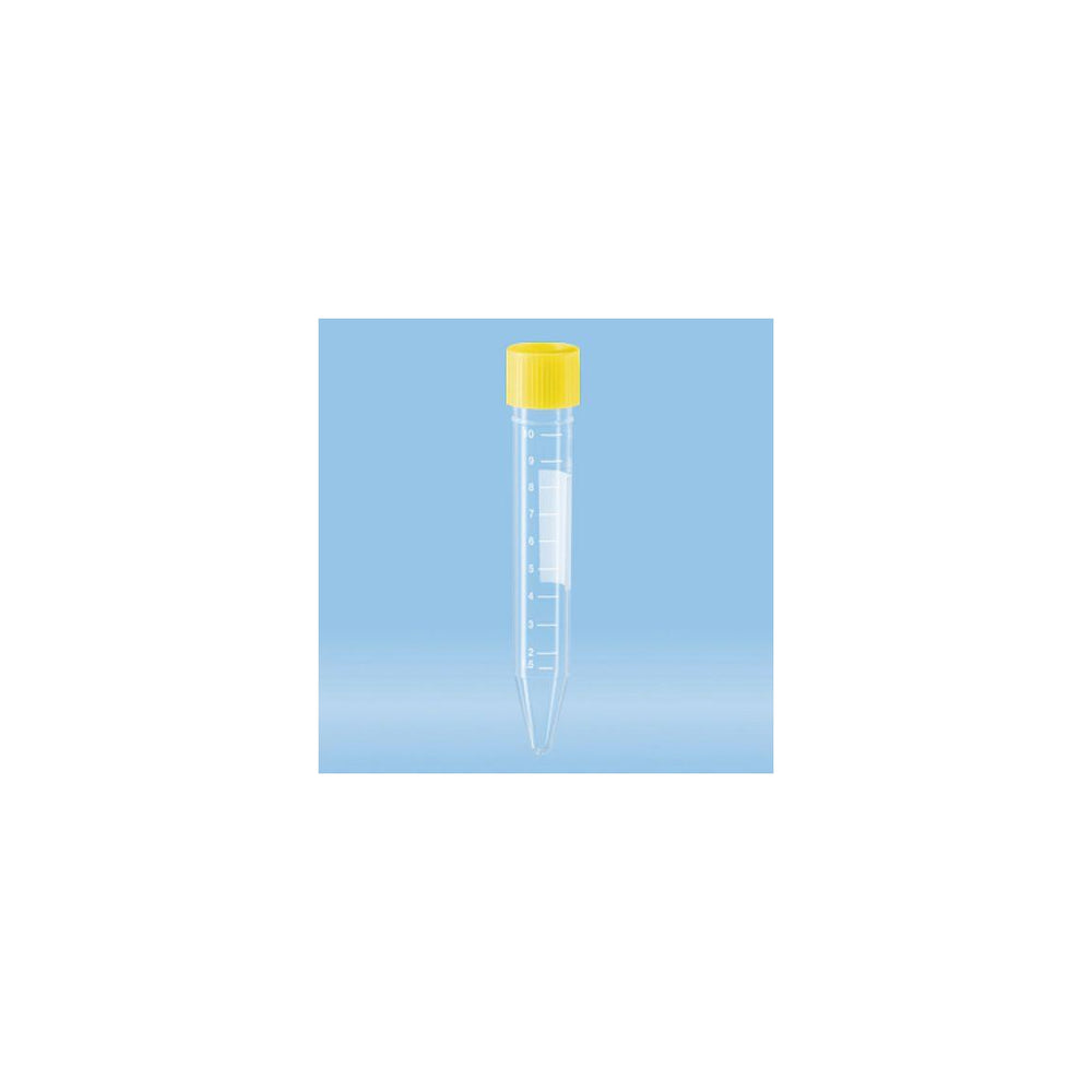 Steril vara. Centrifugrör med konisk botten och gul kork. Sterilt.
