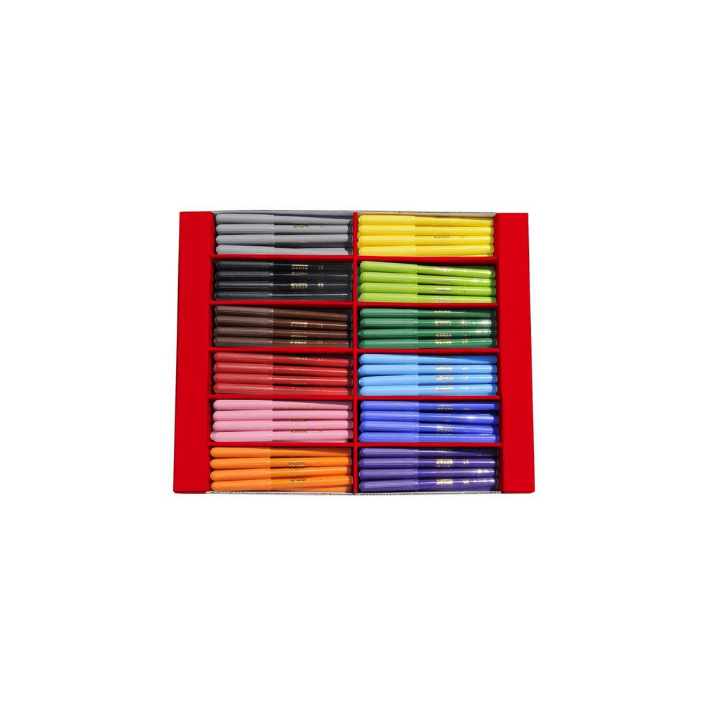 Färgpennor med starka färger och hög täckningsförmåga. De tåliga färgpennorna som levereras i 12 olika färger. Pennan har en linjebredd på 0,6 mm Pennan är tålig och klarar av tuffare tag utan att exemplevis spetsen trycks in vid hårdare belastning. Den ventilerade korken har utformats för att undvika kvävningsrisk. Pennan har lång livslängd. Lämnas pennan utan kork en tid klarar den sig utan att torka ut. - PVC-fri - Tillverkad av: Polypropen (PP) - Huv - Rund spets - Linjebredd 0,6 mm - Textfärg: 12 olika färger - Färg pennkropp: Samma som textfärg Varning. Lämpar sig inte för barn under 3 år