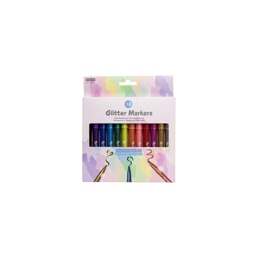 Ett storpack med hela 12 stycken intensivt gnistrande glitterfiberpennor. Passar perfekt för att skriva, rita och dekorera. Pennorna har ventilerade huvar för att undvika kvävningsrisk, samt blockerade spetsar för att udden inte ska tryckas in vid lite hårdare tag. - Kemiskt utvärderade och godkända enligt de högt ställda kraven i Svensk och Europeisk lagstiftning Varning. Lämpar sig inte för barn under 3 år