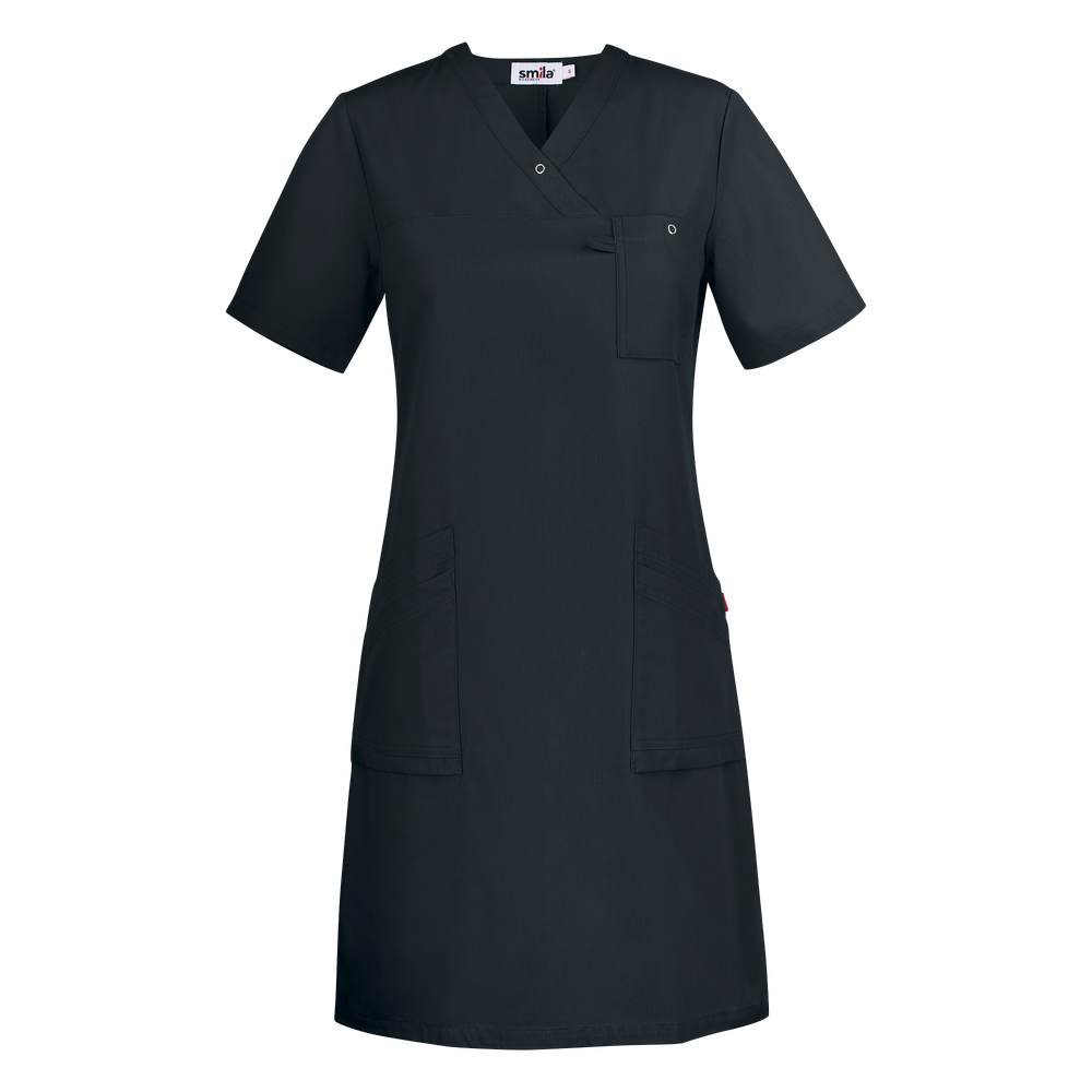 Lätt insvängd klänning med V-ringning och ringknapp. Utrustad med dubbla snedställda framfickor inkl usive nyckel/korthållare samt bröstficka. Adina Dress från Smila Workwear är en elegant och funktionell klänning designad för yrkesverksamma k vinnor inom vård- och omsorgssektorn. Klänningen har en smickrande V-ringning med en dekorativ ringk napp och en lätt insvängd passform som framhäver figuren utan att kompromissa med komforten. De dubb la snedställda fickorna framtill erbjuder praktisk förvaring, inklusive en ficka med nyckel/korthåll are, medan bröstfickan ger snabb tillgång till viktiga föremål. Med en rygglängd på 100 cm i storlek M är Adina Dress utformad för att ge fullständig rörelsefrihet och långvarig komfort under hela arb etsdagen. Smila Workwears fokus på kvalitet och hållbarhet säkerställer att denna klänning inte bara ser bra ut utan också är tålig nog för daglig användning i krävande arbetsmiljöer. Den kombinerar s til och funktion på ett sätt som gör den till ett idealiskt val för kvinnor som vill upprätthålla en professionell och sofistikerad look på jobbet.