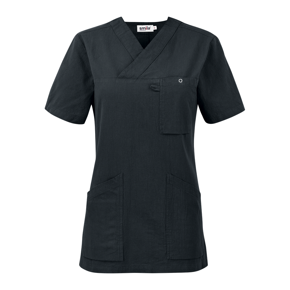V-blus med figurnära passform och insvängd midja. Utrustad med rymliga framfickor inklusive nyckelhå llare och mobilficka samt bröstficka med ringtryckknapp och korthållare. Slits i sidan. Krinklad bom ull. Carin Blouse från Smila Workwear är en elegant och funktionell V-blus designad specifikt för kvinnor inom vård- och omsorgsyrken. Den figurnära passformen med lätt insvängd midja framhäver en feminin silhuett utan att kompromissa med komfort och rörlighet. De rymliga utanpåfickorna framtill, inklusi ve en ficka med nyckelhållare och mobilficka, ger praktiska förvaringslösningar för dina viktigaste arbetsverktyg. Bröstfickan är försedd med en ringtryckknapp och korthållare, vilket gör det enkelt a tt ha snabb åtkomst till ID-kort och andra nödvändigheter. Med en rygglängd på 72,5 cm i storlek M e rbjuder Carin Blouse både stil och funktionalitet, vilket gör den idealisk för yrkesverksamma som vi ll kombinera en professionell framtoning med praktiska detaljer i sina arbetskläder. Smila Workwears noggranna materialval och höga standarder säkerställer att denna blus håller för daglig användning i krävande arbetsmiljöer.