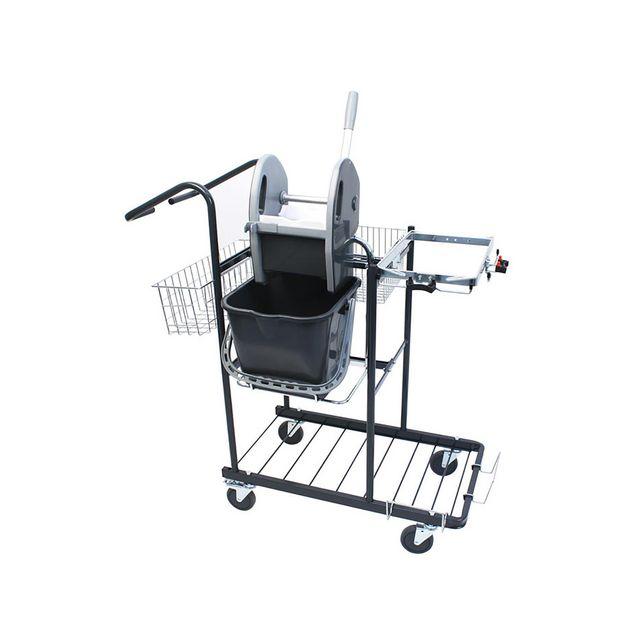 Prisvärd städvagn innehållande svabbpress och materialkorg i arbetshöjd. Samt en lång korg på styret.