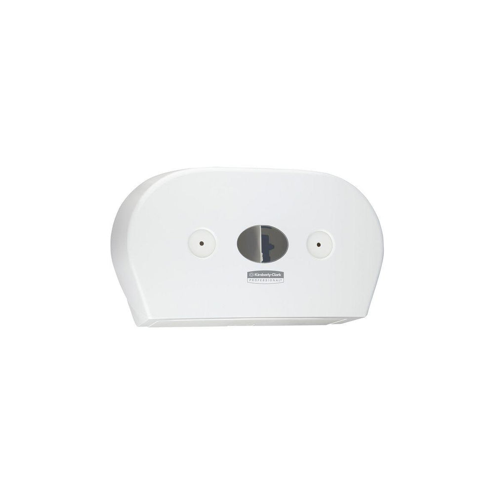 Centrummatad dispenser som rymmer två rullar toalettpapper, perfekt för mindre utrymmen.
