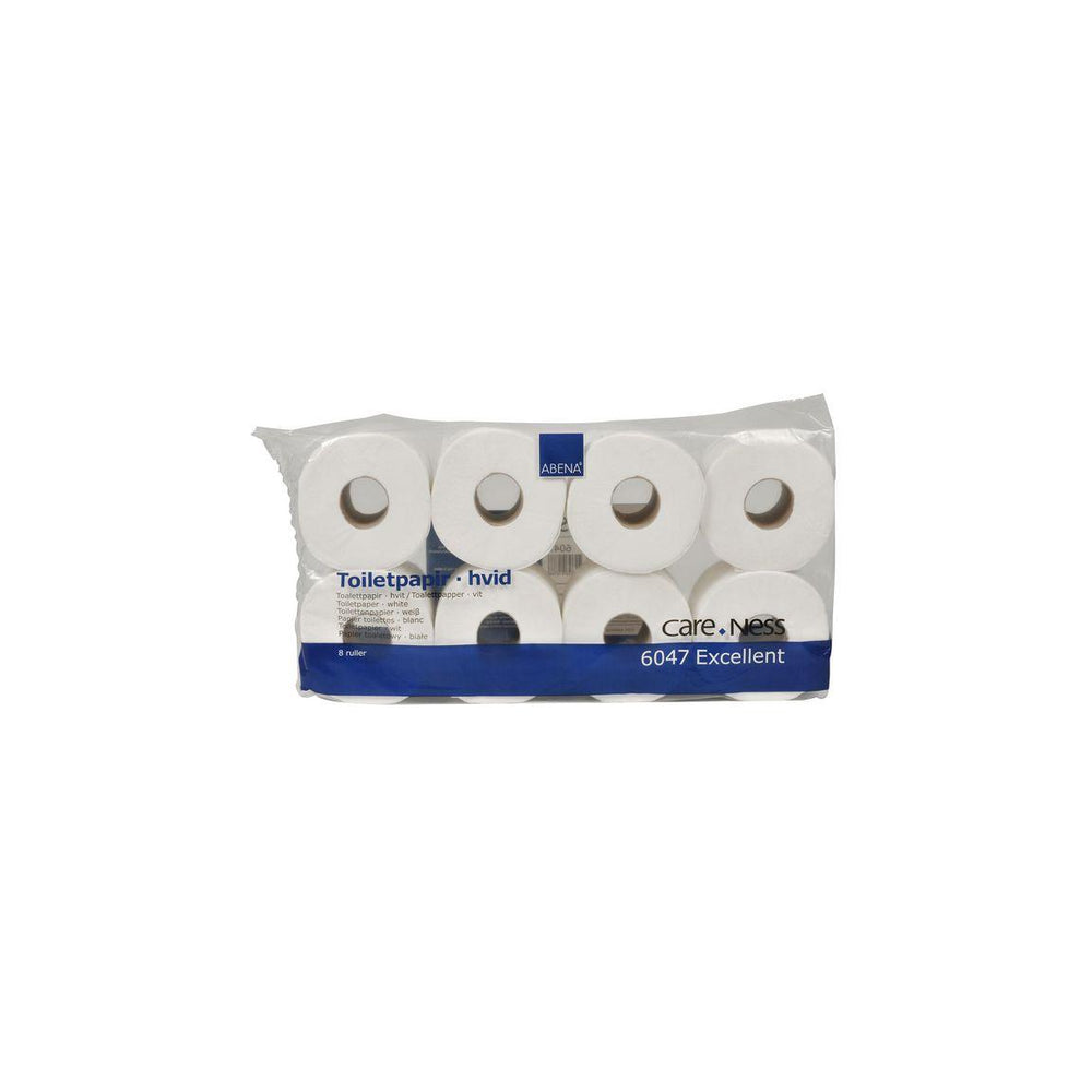 Ett extra mjukt och starkt perforerat toalettpapper av nyfiber. Det vita toalettpappret är skonsamt mot huden och bekvämt att använda.