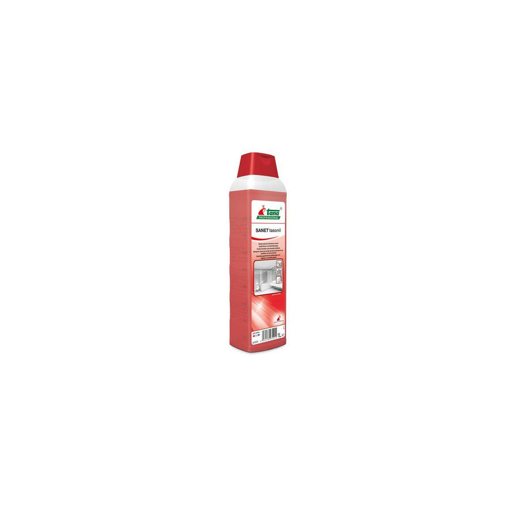 SANET tasonil har en mycket stark rengöringsverkan på alla typer av smuts i det sanitära området. Speciellt effektiv mot kalk, urinsten och rester av kalktvål. Den viskösa konsistensen främjar en snabb och fullständig smutsavlägsning även på vertikala ytor. Är vänlig mot underlaget och ger en strålande glans på alla ytor och lämnar en bestående fräsch doft. Passar alla syrafasta ytor inom hela sanitetsutrymmet, såsom kakel, förkromad beslag, porslin, rostfritt stål, anonized metall, plast, stengods, gummiduk, etc. Använd inte på natursten (t ex marmor) eller syrakänslig emalj. - pH-värde: 0.5 (koncentrat), 3 (brukslösning) - Parfymerad - Dosering: Daglig rengöring: 1,25-2,5 ml /L, Maskinell rengöring: 20 ml /L, Avkalkning: Koncentrerad. - Utseende: Röd vätska
