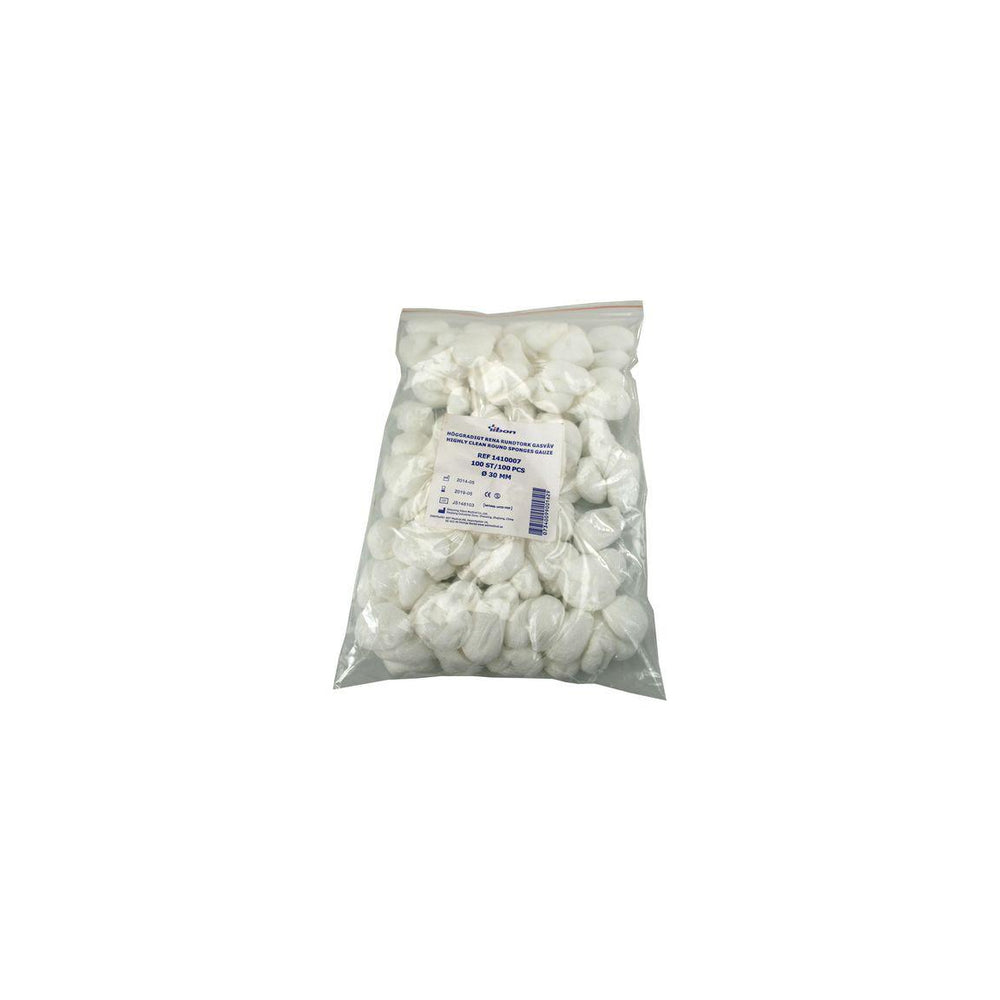 Round dryer gauze - Highly clean - Latex free - Elastic ring: Material: Silicone - Colour: White - Packaging: Resealable plastic bag - Autoclavable: EO or steam 135 °C - CE marking: Class 1 according to MDD - Manufacturing: China - Certification: ISO 9001:2008 & ISO 13485:2012 - Storage: 5 years from the date of manufacture, in a dry and cool place without direct sunlight or - influence of heat source - 100% bleached cotton - 17 threads - Warp: 104 ± 4 - Weft: 72 ± 4