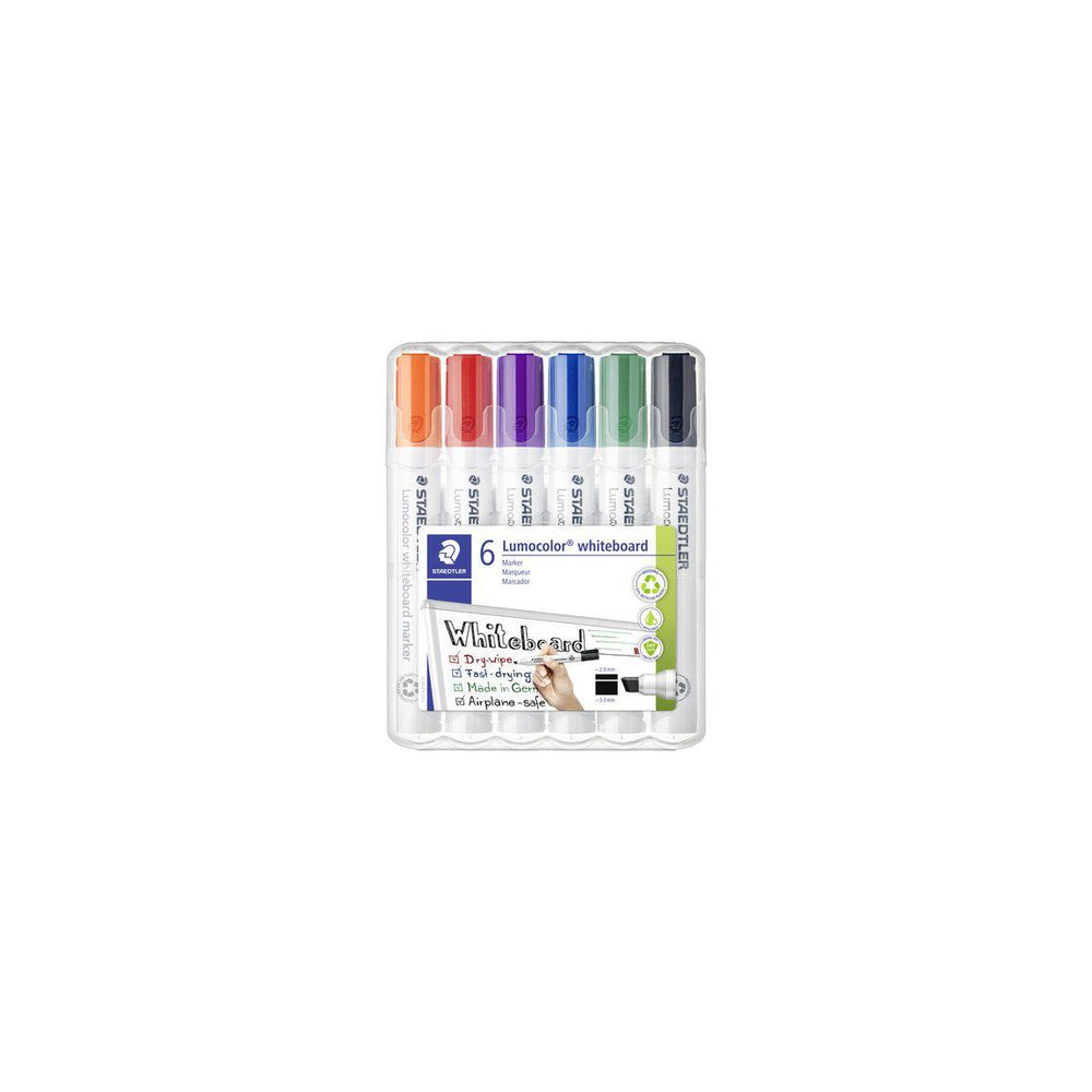 Lumocolor® Whiteboard Pens 351 are fast drying, low odour and can be wiped off whiteboards and surfaces such as glass, porcelain, without leaving traces. They also have a so-called DRY SAFE property, which means that they can be left uncorked for several days without drying (Standard Atmosphere according to ISO 554). In addition to DRY SAFE, they are also Aircraft Safe, which means that automatic pressure equalisation prevents the pen from leaking on board aircraft. The PP pen body and cap ensure long life and its inks are Xylene and Toluene free. These Lumocolor® Whiteboard pens 351 with cut tip come in a smart plastic STAEDTLER box. - Cap - Cut tip - Line width: 2-5 mm - Writing colour: Orange, Red, Purple, Blue, Green, Black - Pen body colour: White - Pre-consumer recycled plastic 97%