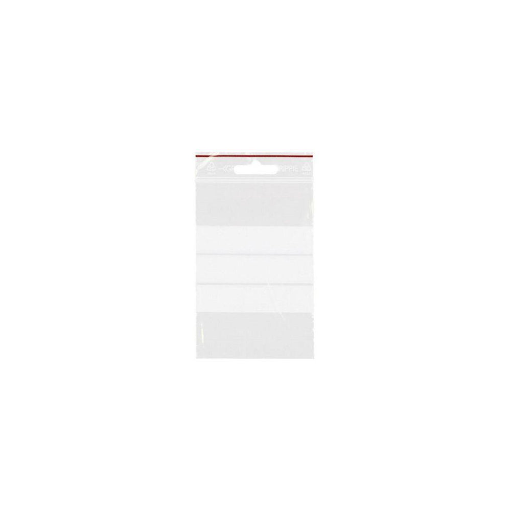 Zipper bag made of LDPE with 5mm euro holes for hanging and three white writing fields. With strong zip closure and red line marking. Food grade approved. 100 bags per bundle, 1000 bags per pack - Size: 80x120mm (inner dimensions) - Model: T-65 - Thickness: 50 micron - Hole: Euro hole - Volume: 0.17 litres