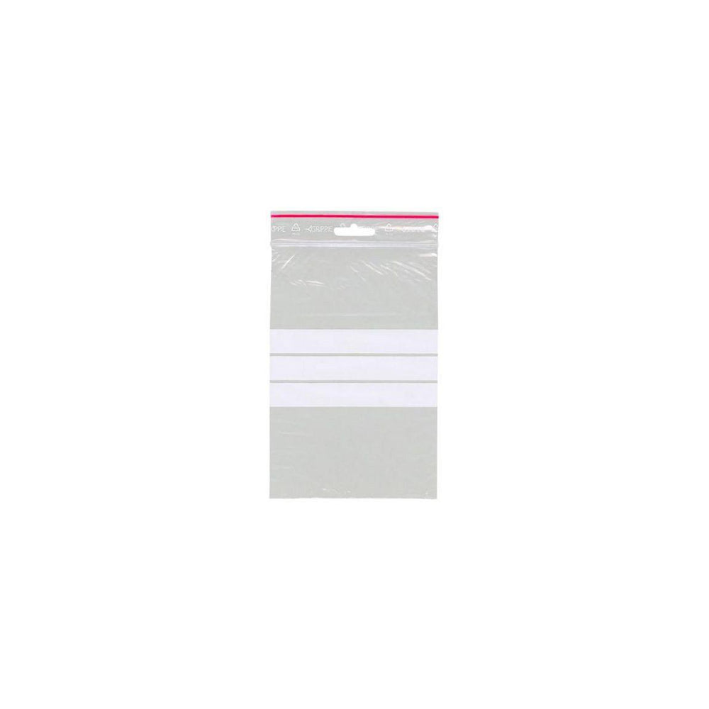 Zipper bag made of LDPE with 5mm euro holes for hanging and three white writing fields. With strong zip closure and red line marking. Food grade approved. 100 bags per bundle, 1000 bags per pack - Size: 120x180mm (inner dimensions) - Model: T-68 - Thickness: 50 micron - Hole: Euro hole - Volume: 0.55 litres