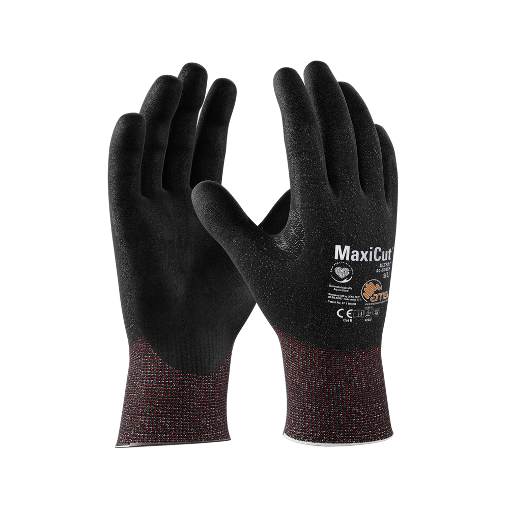 MaxiCut® UltraTM 44-6745F is thin, ventilated, durable and cut-resistant skin-friendly glove and perf ect fit made of Nylon/Polyester/UHMWPE/Spandex/Tungsten and dipped in Nitrile foam, for work in dry environments.