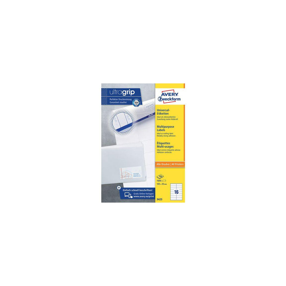 Do you have several different types of printers in your office? No problem, you only need to buy one type of label - with Avery's white 3423 permanent indoor universal labels with 16 labels/sheet and 1,600 labels/pack, you get labels that can be used in mono and colour laser printers, inkjet printers and photocopiers. So you don't have to worry about whether you have put labels for the inkjet printer in the laser printer. The labels are suitable for a wide range of applications where you need to use permanent marking, such as address labels on small letters, labelling items or organising folders. They adhere securely, reliably and permanently to all kinds of smooth surfaces. Paper quality is optimised to give you neat, crisp prints whatever type of printer you use. Labels with reinforced grip, ultragrip. A unique 3D pattern on the sheets allows the printer to get a perfect grip on them. These grip zones allow the printer rollers to grip, feed and guide the label sheets even better. Precise printing without paper jams is guaranteed! Avery universal labels not only save you time and hassle, they also help you to preserve the environment as they are FSC® certified and therefore only produced from sustainably sourced paper and can be recycled with general paper waste. At www.avery.eu you will find lots of templates that you can use to design and print your Avery labels easily and for FREE - Dimensions: 105x35mm