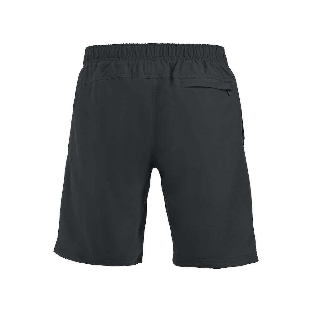 Sports shorts with contrast piping at side seams. Two front pockets and one back pocket with zip closure. Mesh lining inside. Elastic and drawstring at waist.