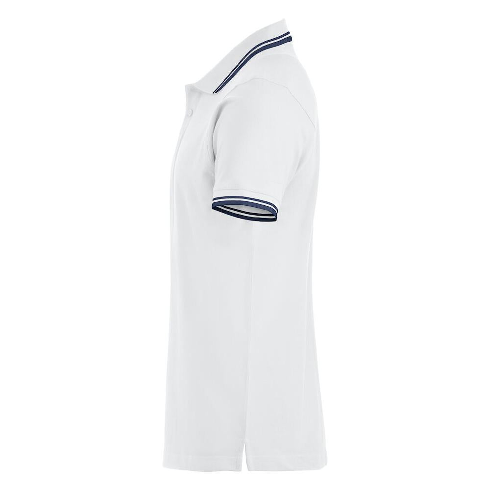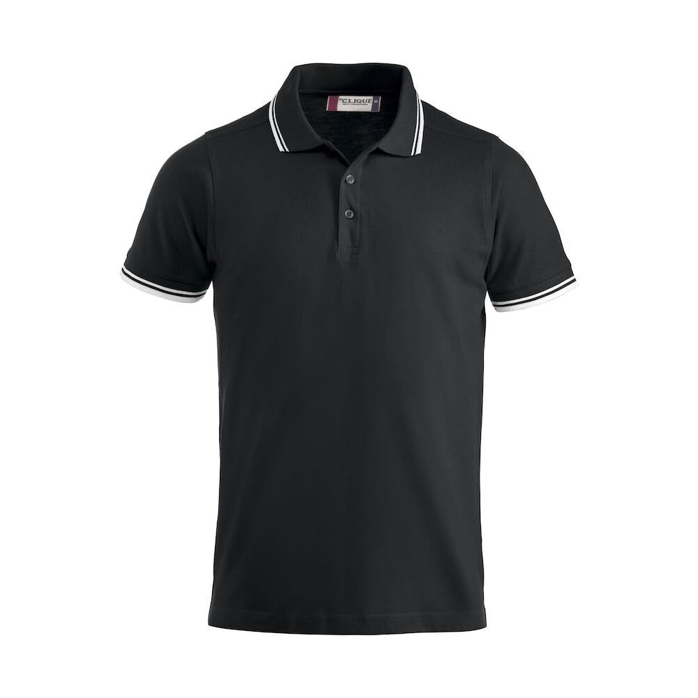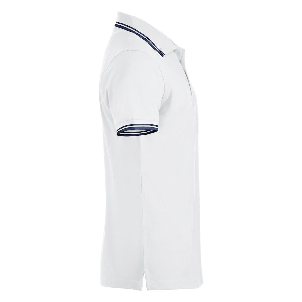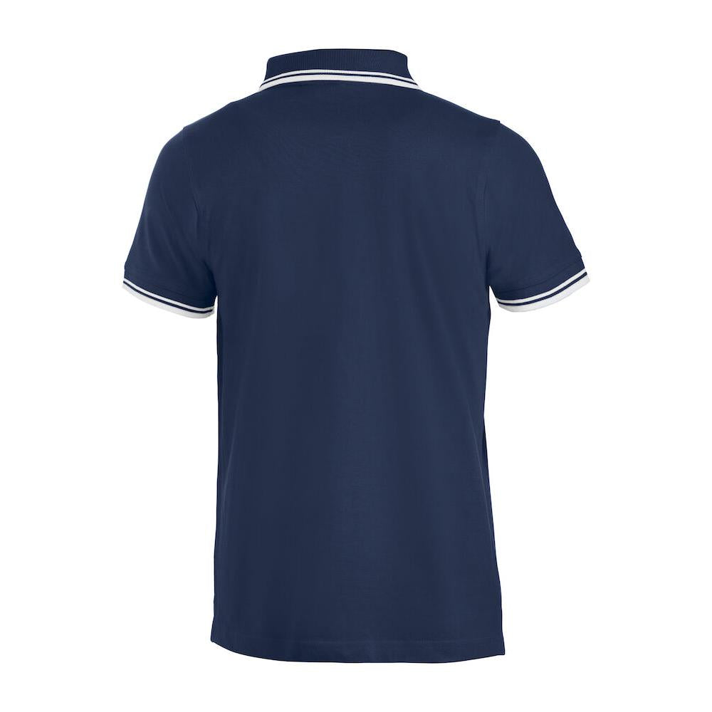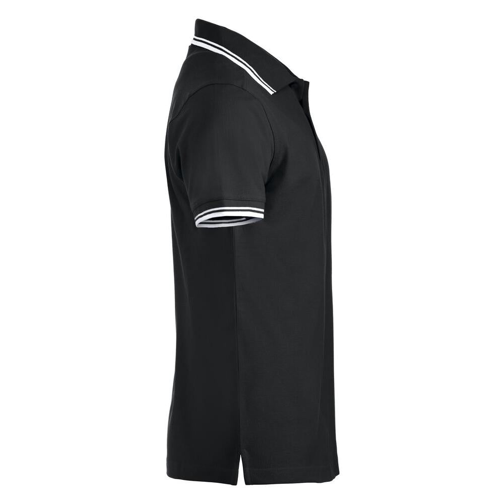 Polo piqué with side vents and contrast colour stripes on collar and sleeve endings.