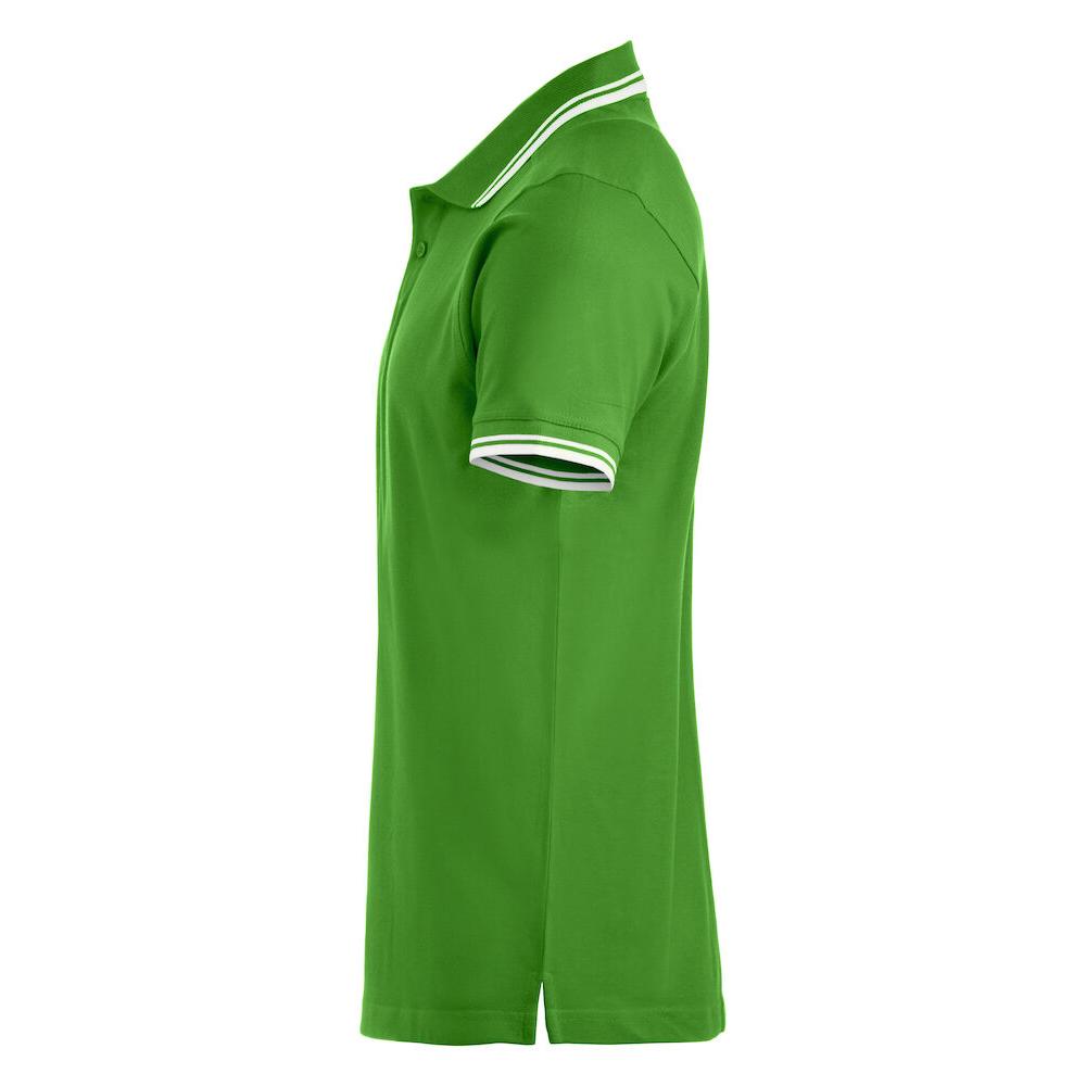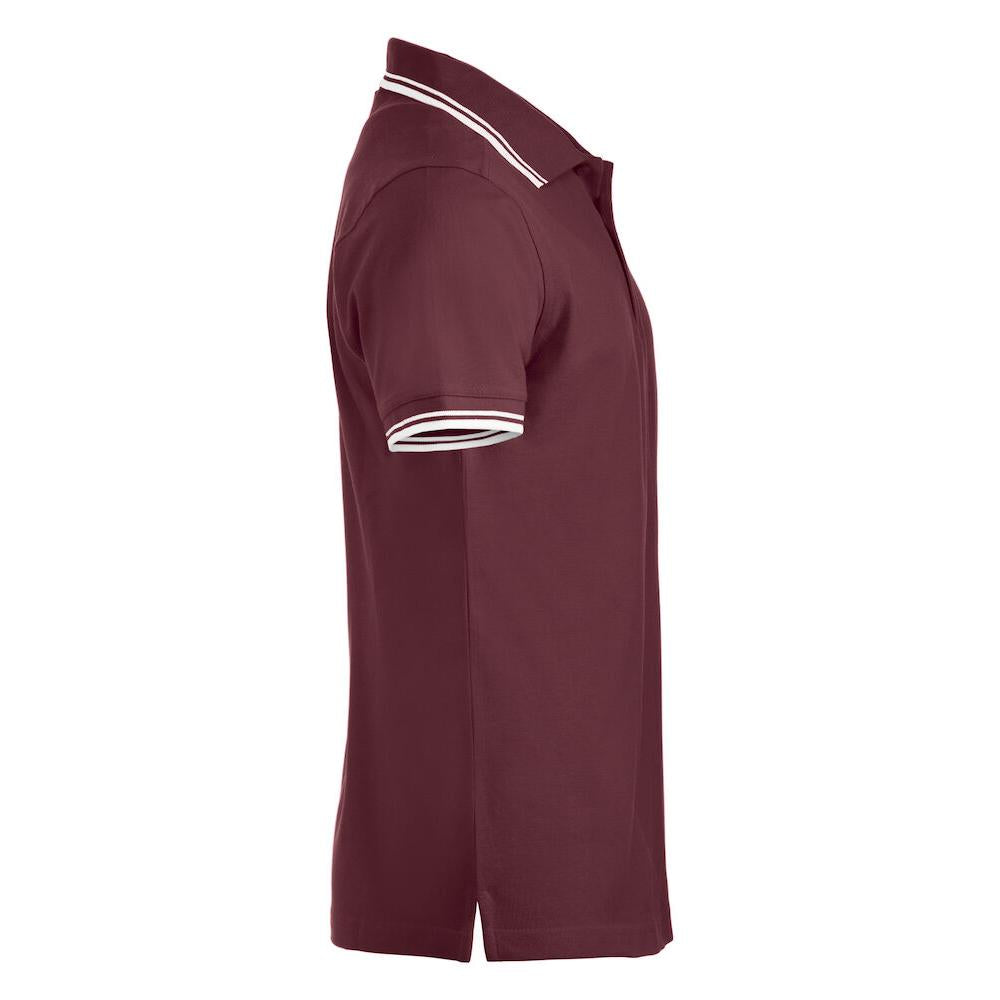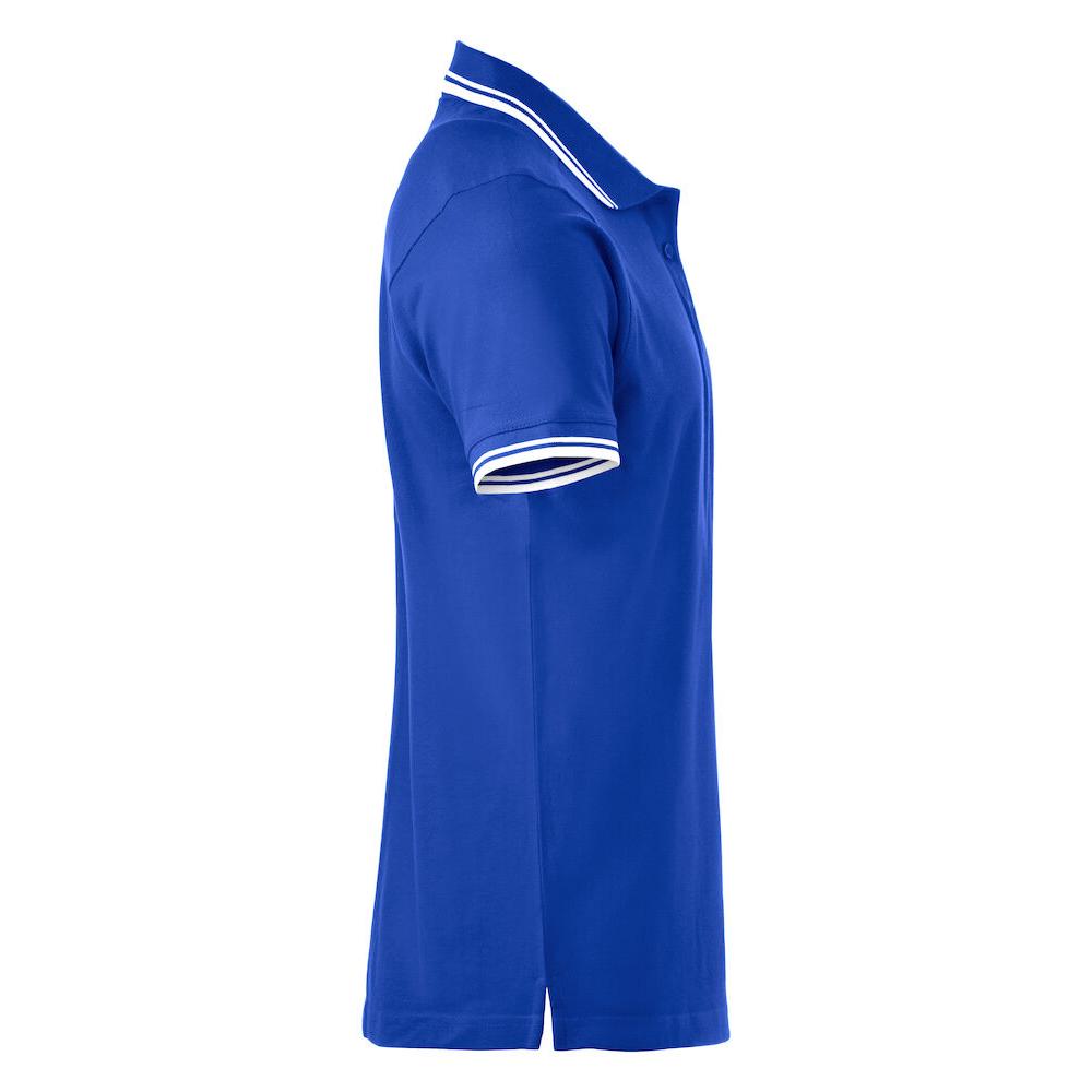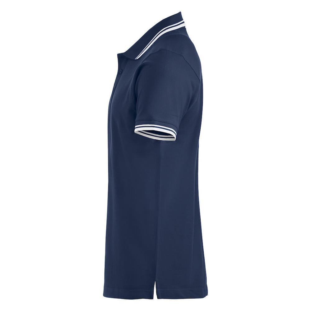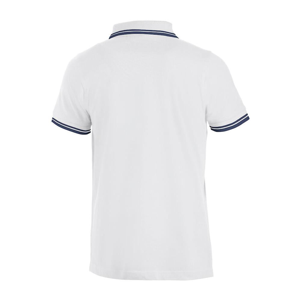 Polo piqué with side vents and contrast colour stripes on collar and sleeve endings.