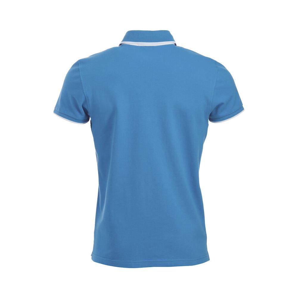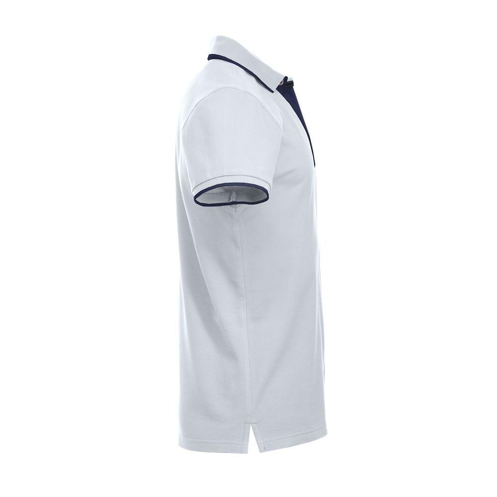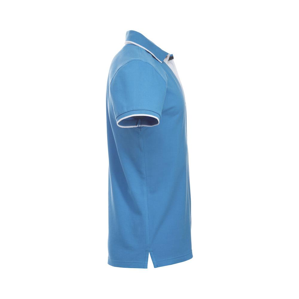 Polo with colour contrast for buttons, necktape, placket and side vent. Standing shirt collar and placket with 3 buttons on men's and 5 on ladies. Contrast stripe at collar and sleeve end.
