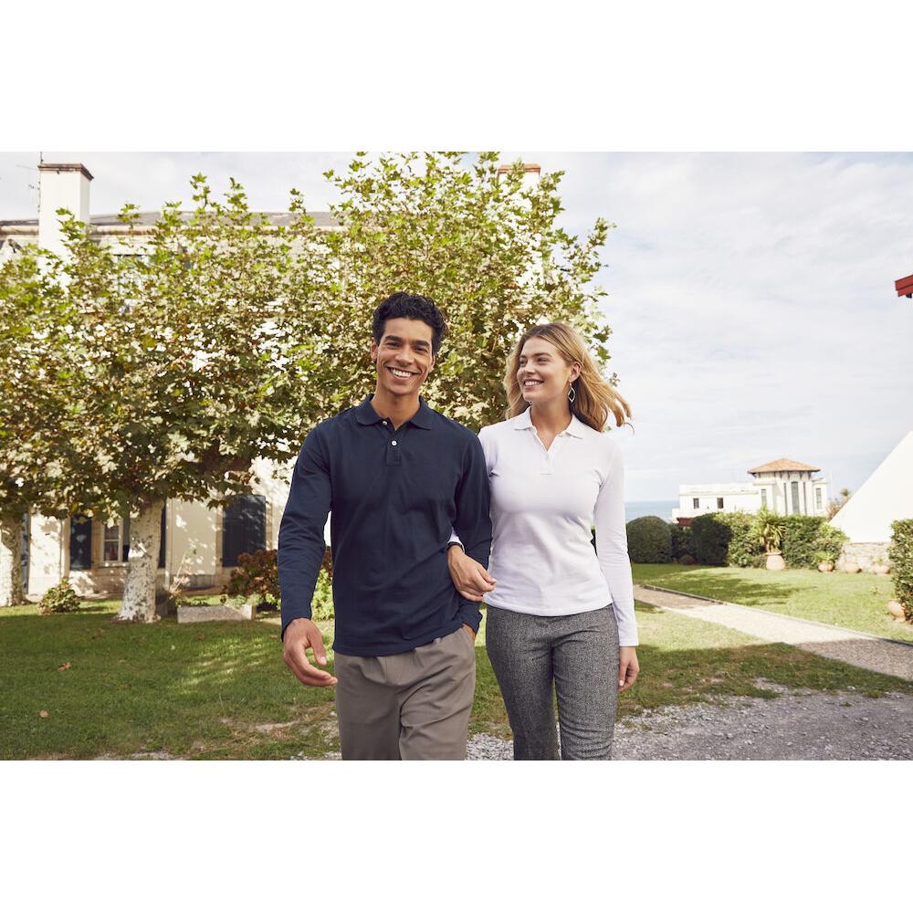 A high quality long sleeve polo with a good stretch. This cuffless polo features 2 buttons with pearl look on man men's and 3 on ladies. Herringbone neck tape and a bartac cross in side-split. An easy removable label for rebranding. Garment is preshrunk and enzyme treated.