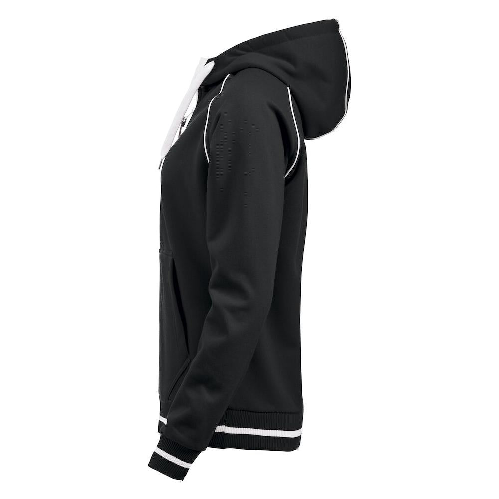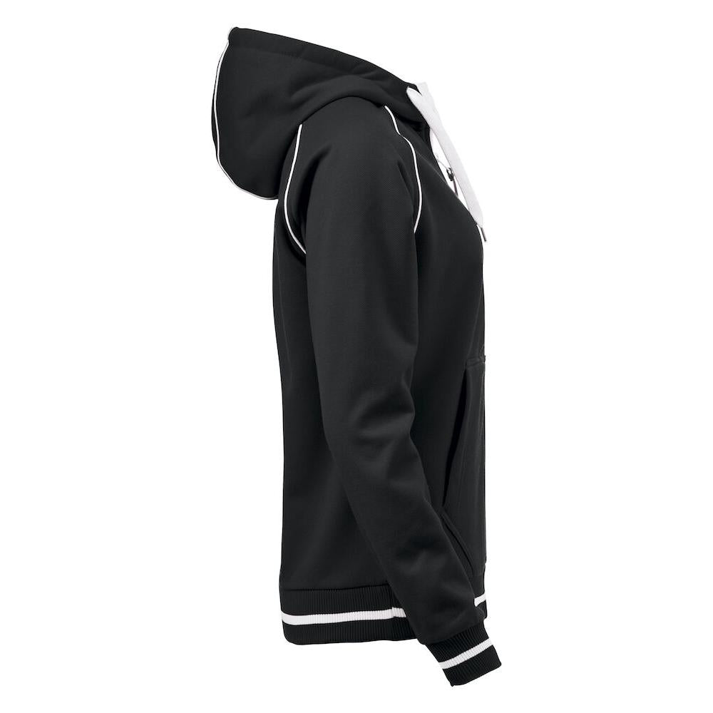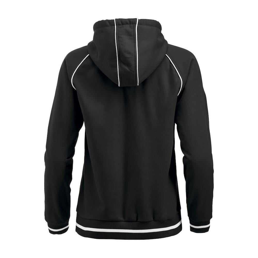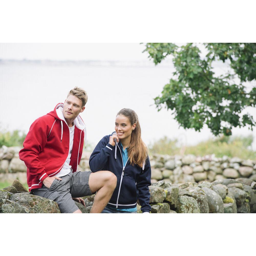 Hoody with brushed inside and structure knit on outside. Hood is with lining and zip for decoration. Contrast colour inside hood, piping, stripe at rib and front zip.