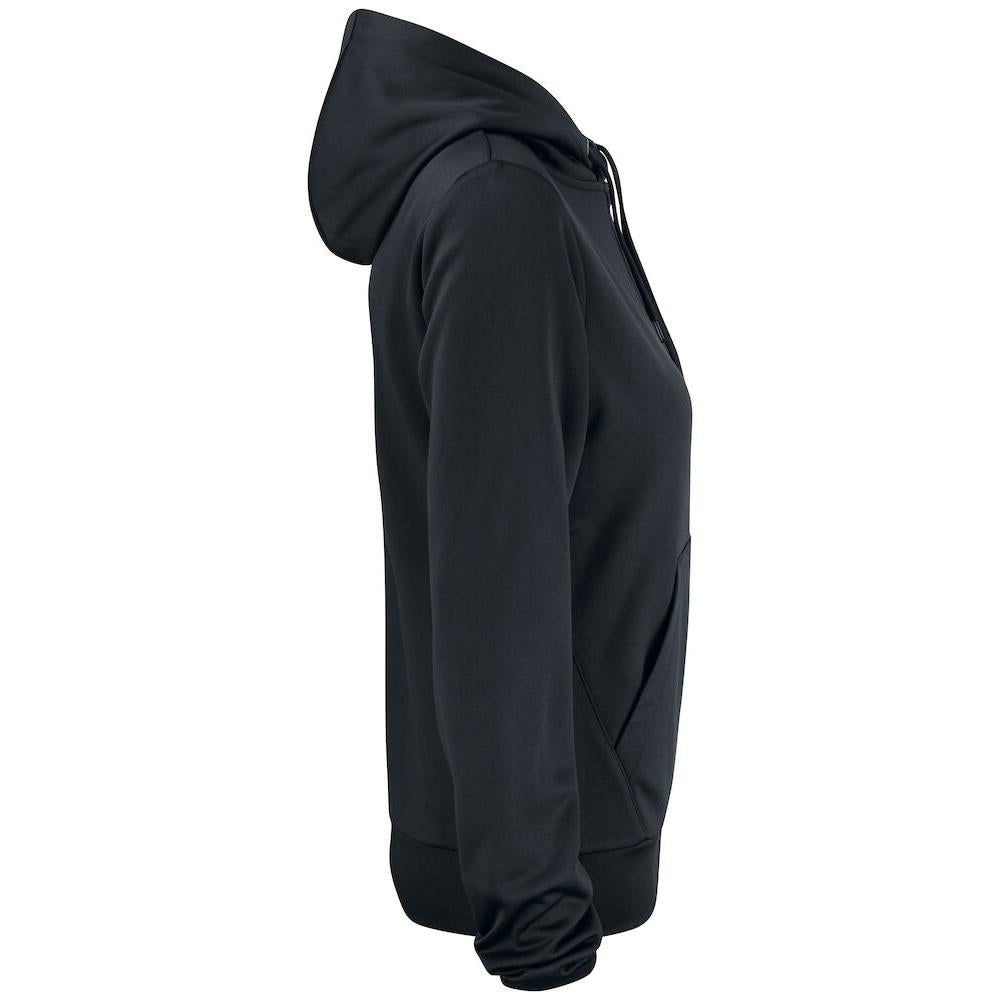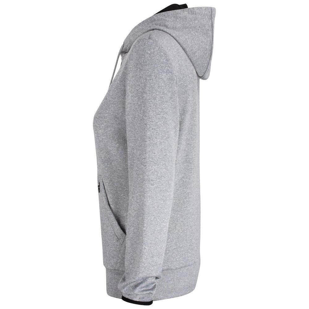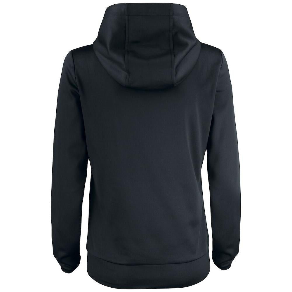 Functional and sporty hooded sweater. Comes with a kangaroo pocket and additional hidden pocket with zipper. Hood has mesh lining and a drawstring. Elastic tipping at bottom sleeves. Cuff in shell fabric at bottom.
